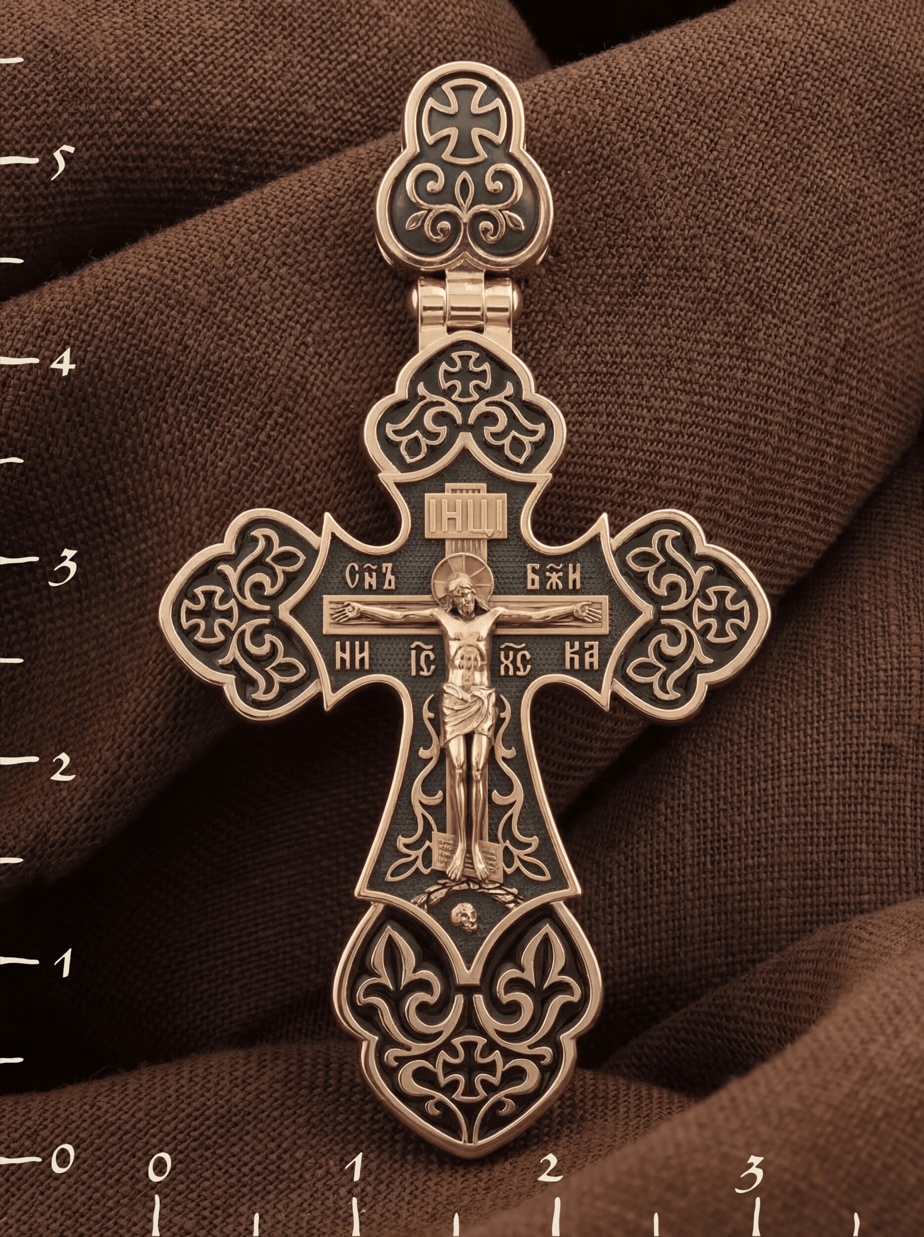 В верхней части Распятия у изголовья Иисуса Христа видна табличка с аббревиатурой «IНЦI» — «Иисус Назорей Царь Иудейский», которая, согласно Евангелию, была прибита к кресту после Его Распятия. Внизу, у подножия Господа, можно увидеть гору Голгофу с Главой Адамовой в пещере. Сам образ Распятия сопровождается каноническими надписями. Это святое имя Христа, которое принято писать на иконах сокращенно — «ИС ХС», словосочетание «СЫН БОЖИЙ», что означает божественную природу Иисуса Христа, и надпись «НИКА», обозначающая «победитель».