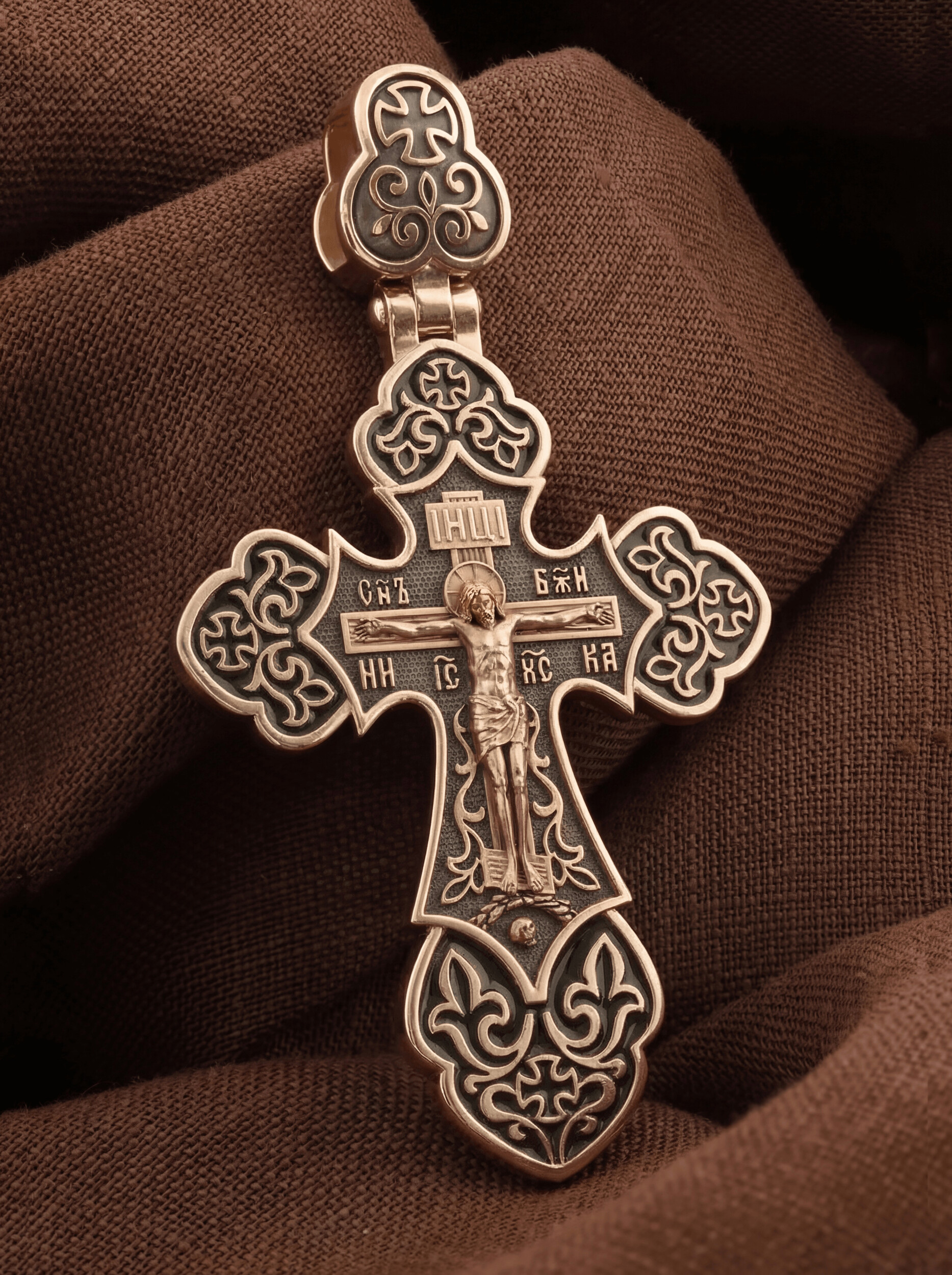 Крест с рельефным изображением Распятия в окружении пышных цветов и ажурного узора, напоминает нам о красоте Райского сада. Такой крест вводит мотив процветшего креста и ассоциируется с образом райского Древа Жизни. Как через древо познания пришла смерть, так через Крест Христа — «Древо Жизни» — даровано спасение.