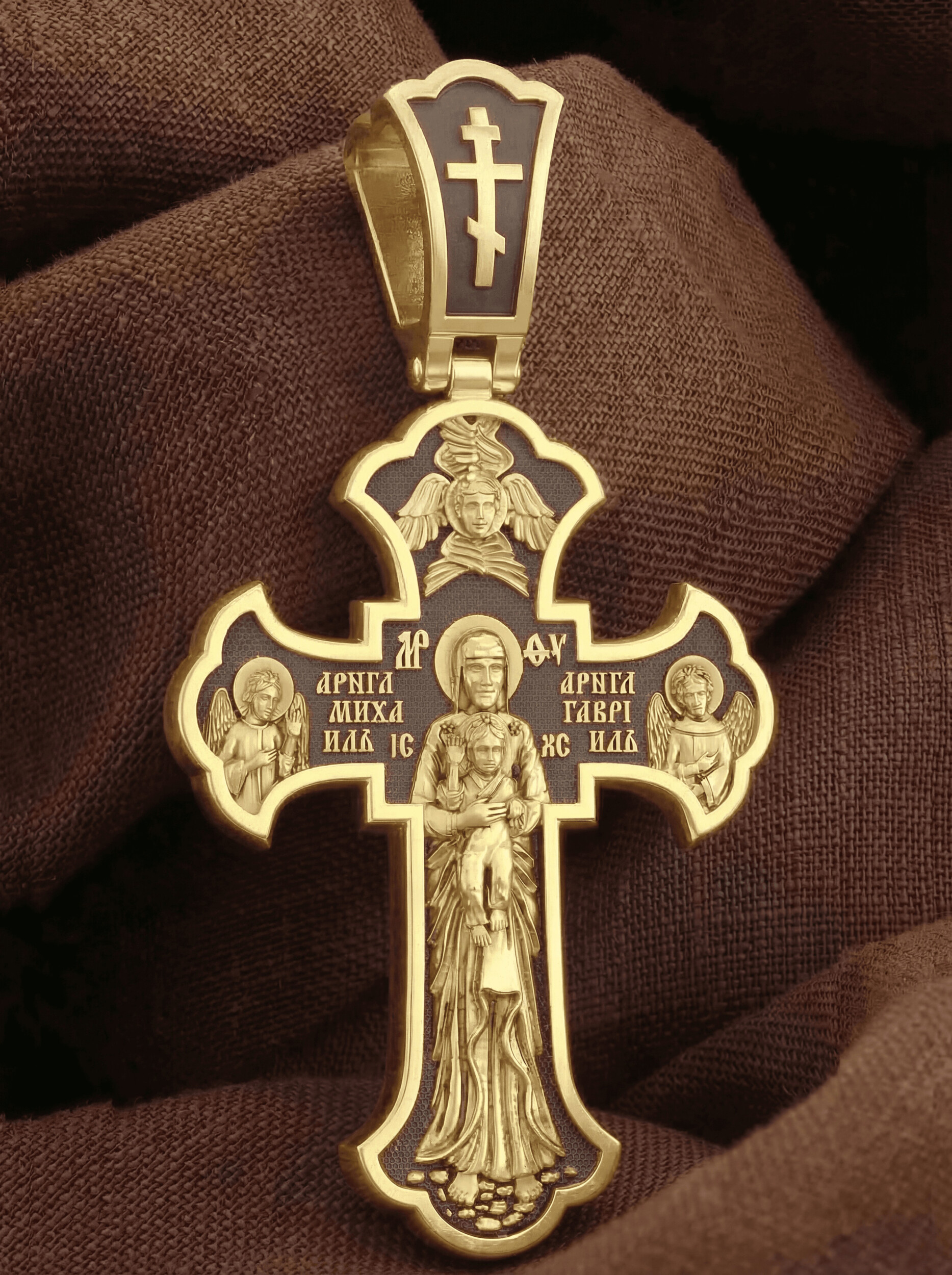 На обратной стороне креста в полный рост изображена Валаамская икона Божией Матери, над которой раскрыл свои крылья серафим. Этот образ написал в 1878 году иеромонах Валаамского монастыря о. Алипий. Валаамскую икону прославили многие чудеса, ее считают целительницей при разных недугах. Перед этим образом Богородицу молят в первую очередь об укреплении веры, просят даровать смирение, твердость в соблюдении заповедей Христовых и об исцелении. Богородице предстоят два архангела, Михаил и Гавриил.