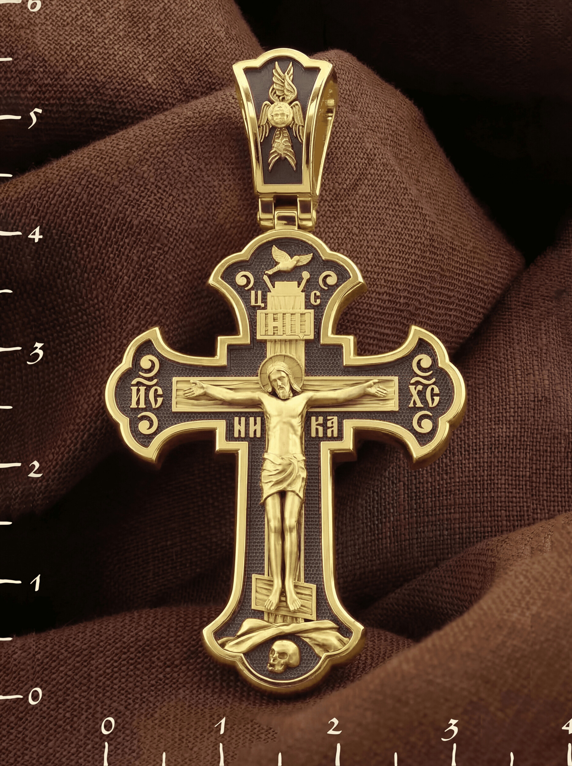 На лицевой стороне этого креста центральную часть занимает икона Распятия Христа — образ жертвы, принесенной Господом за грехи людей. Именно ко Христу, сошедшему на землю ради нашего спасения, возносятся все молитвы. Пресвятая Богородица, ангелы и святые — помощники Господа в деле спасения и заступники за людей перед Богом. «Оружием великим Христовым» именует Церковь крест, потому что, претерпев страдания и умерев, Господь победил смерть и лишил дьявола его власти над миром. Поэтому рядом с титлами Святого имени Христа написано «НИКА», что значит «победитель».