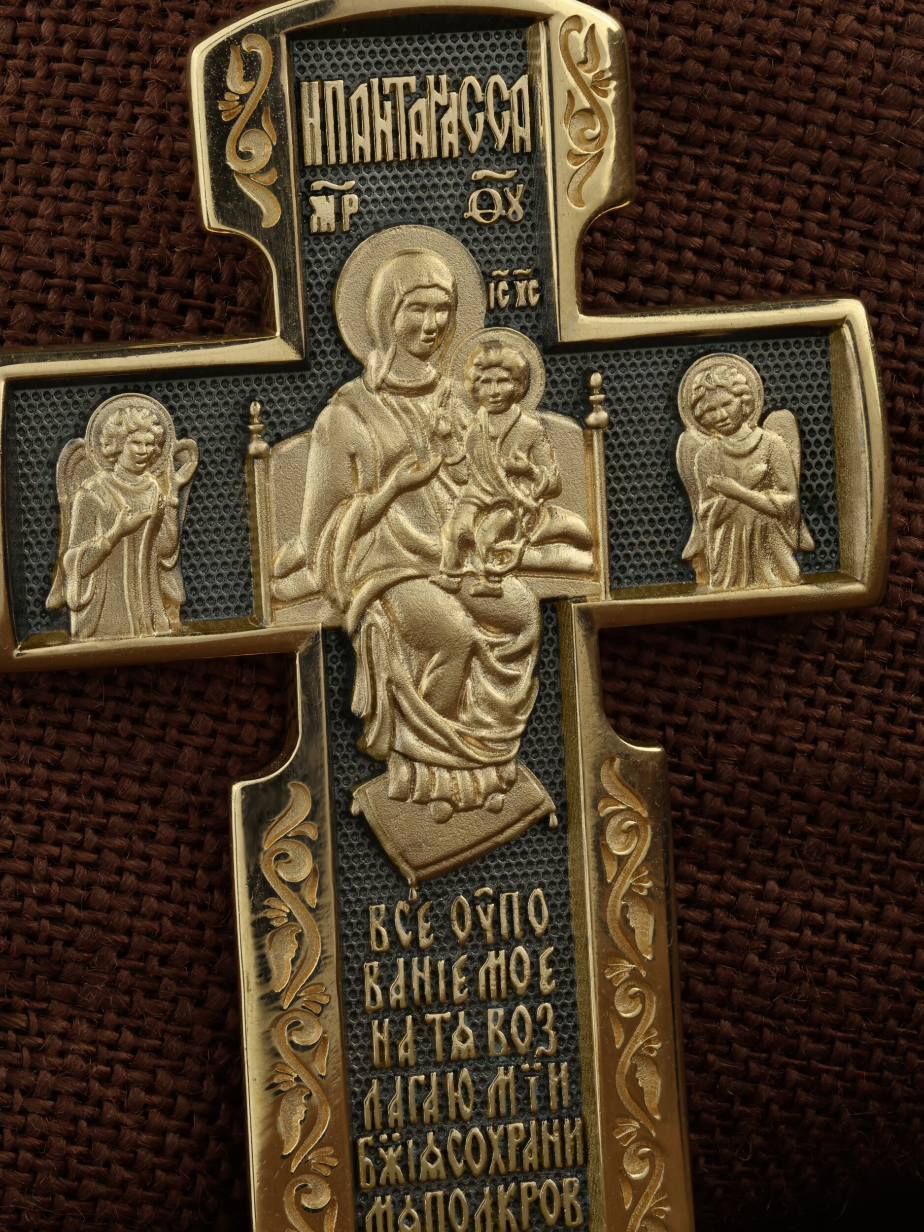 Весь оборот креста занимает икона Божией Матери «Всецарица». Внизу креста написана молитва обращенная к Божией Матери «Все упование мое на Тя возлагаю, Мати Божия, сохрани мя под кровом Твоим».