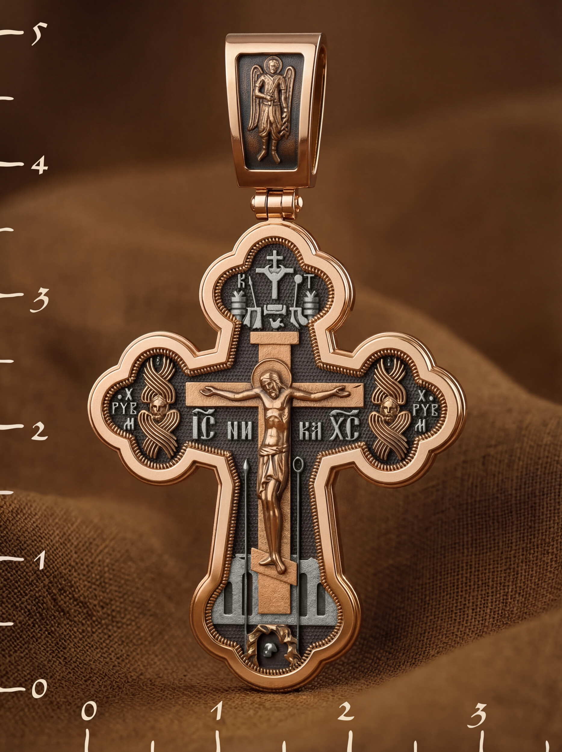 Основой композиции лицевой стороны креста является Распятие Иисуса Христа. Справа и слева от Распятия изображены Ангелы, первыми стоящие у Престола Господа — Херувимы. Под основной перекладиной рядом с титлами Святого имени Христа написано «НИКА», что значит «победитель». Сверху над Распятием помещен Голгофский Крест с цатой, рядом с которым, орудия страданий Господа — трость и копие, обозначенные буквами «Т» и «К».