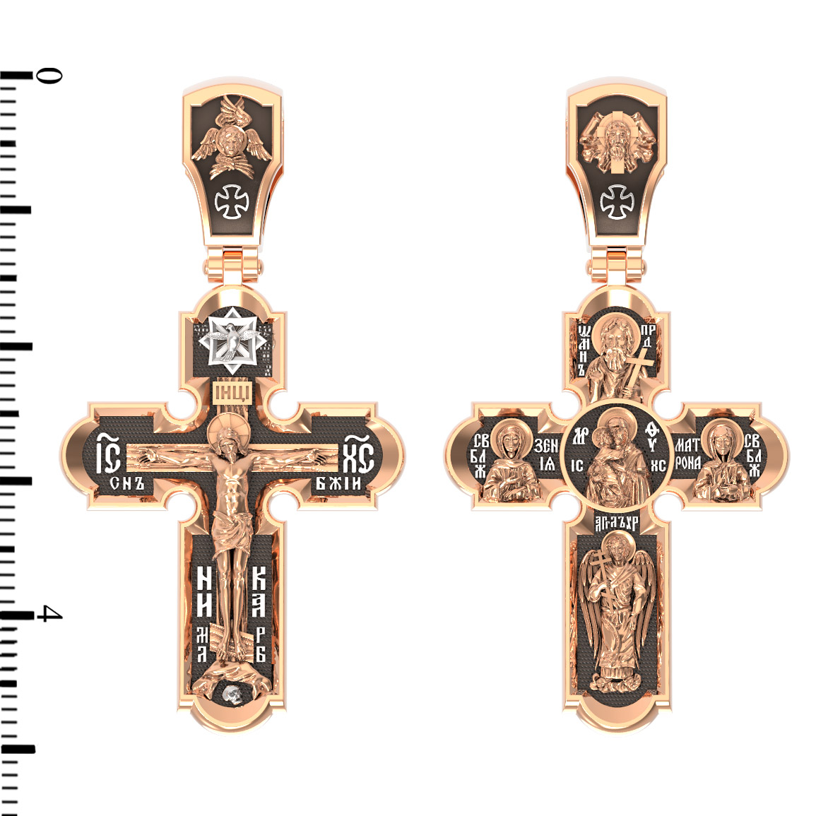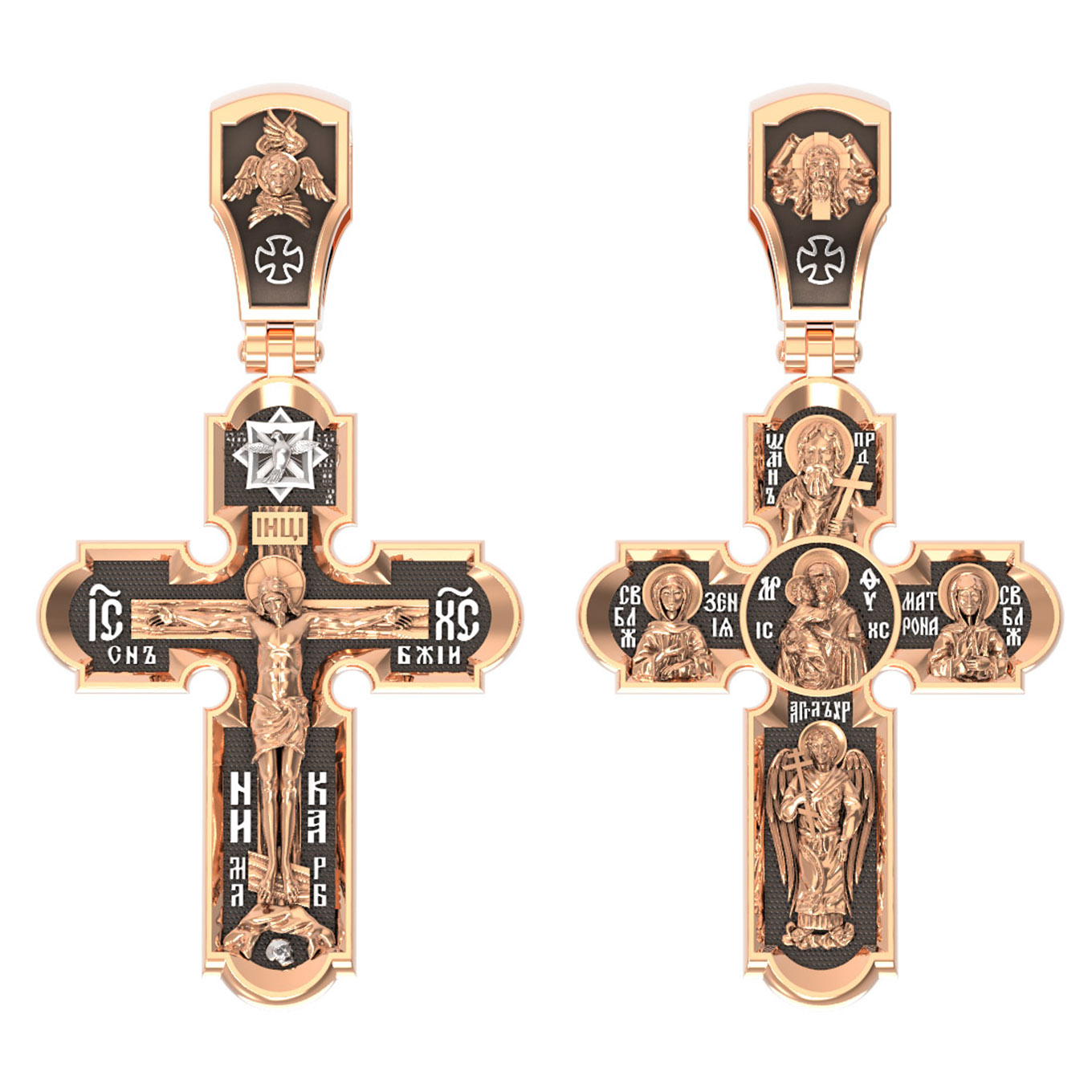 На кресте внизу изображен Ангел Хранитель, слева — Святая Блаженная Ксения, справа — Святая Блаженная Матрона, вверху — пророк, почитающийся в христианстве, Предтеча Господень Иоанн Креститель. На кулонном кольце помещено изображение Спаса Нерукотворного — образ Спасителя, который Он запечатлел на плате и передал для исцеления больному проказой царю Эдессы. Ему придается победное и защитное значение.