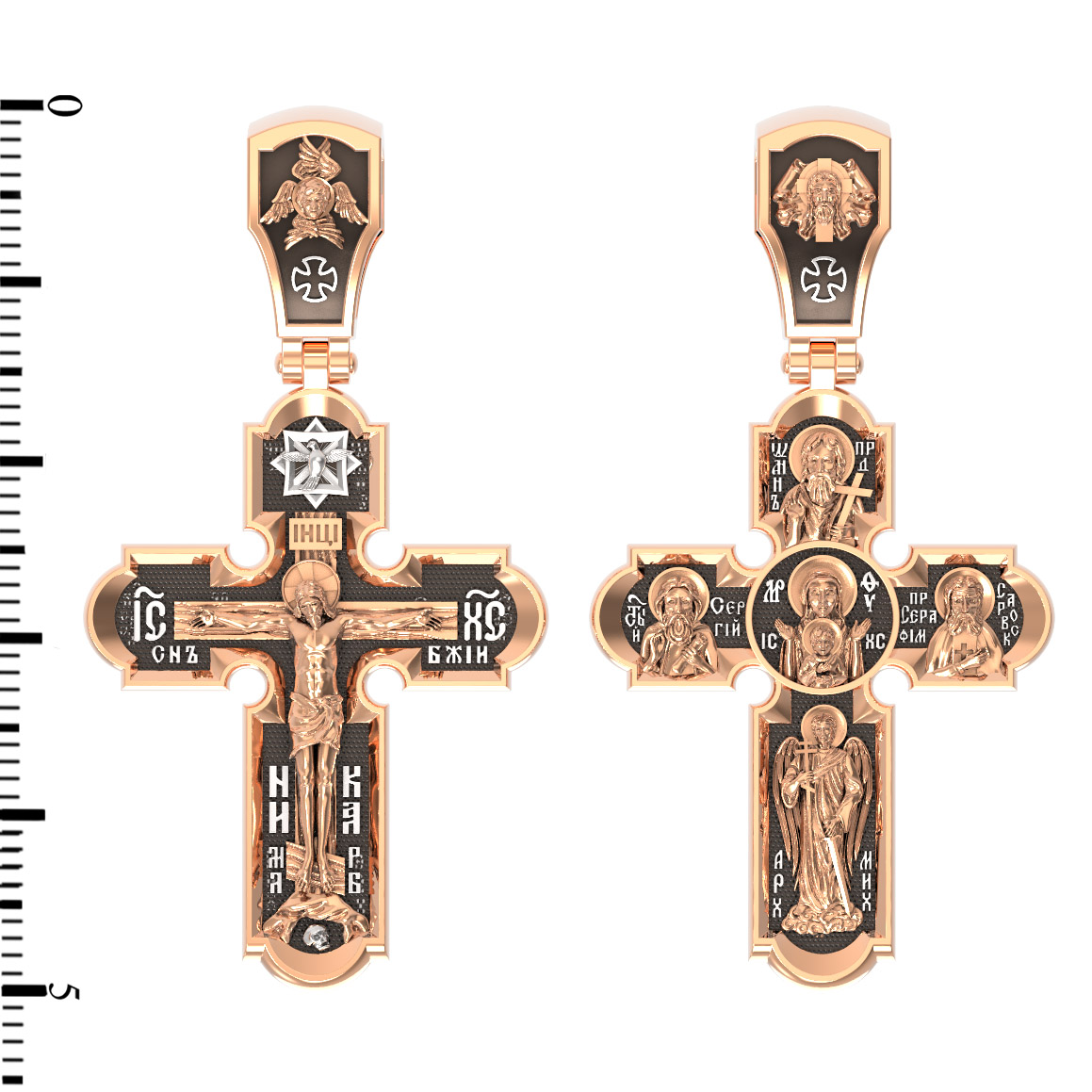 Центральную часть оборотной стороны креста украшает икона Божией Матери «Знамение». Иконы Божией Матери, известные под именем «Знамение», появились на Руси в XI — XII веках, а называться так стали после чудесного знамения от Новгородской иконы, случившегося в 1170 году. Многочисленные списки с иконы Знамения известны по всей России. На кресте внизу изображен Архангел Михаил, слева — Преподобный Сергий Радонежский, справа — Преподобный Серафим Саровский, вверху — Предтеча Господень Иоанн Креститель. На кулонном кольце помещено изображение Спаса Нерукотворного — образ Спасителя, который Он запечатлел на плате и передал для исцеления больному проказой царю Эдессы. Ему придается победное и защитное значение.