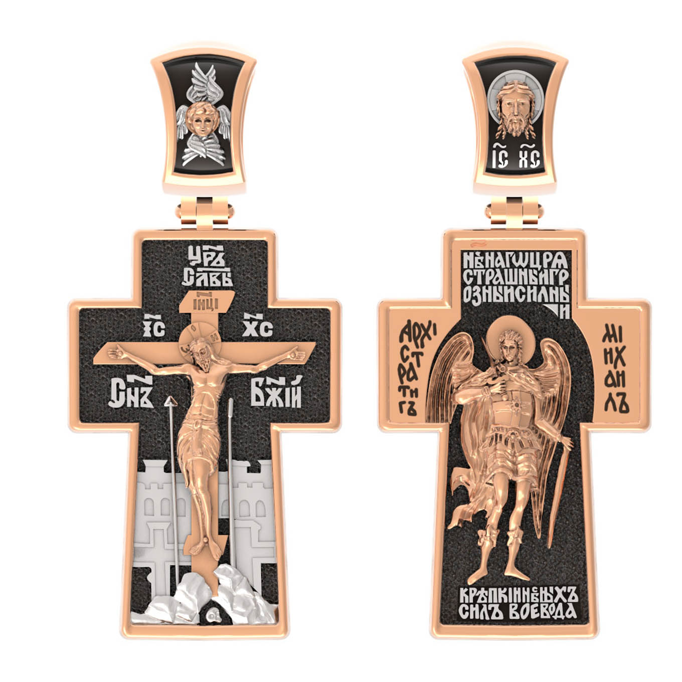 В центре оборота креста изображен Архистратиг Михаил. Могучий Архангел почитается как покровитель воинов и всех верных Богу и ведущих борьбу против сил зла, а также защитник душ умерших, страж райских врат. Вокруг его образа написаны слова: «Небесного царя страшный, грозный, сильный, крепкий небесных сил воевода Архистратиг Михаил».На кулонном кольце изображен Спас Нерукотворный — Символ вочеловечившегося Божества и шестикрылый Серафим — самый приближенный к Господу Ангел.