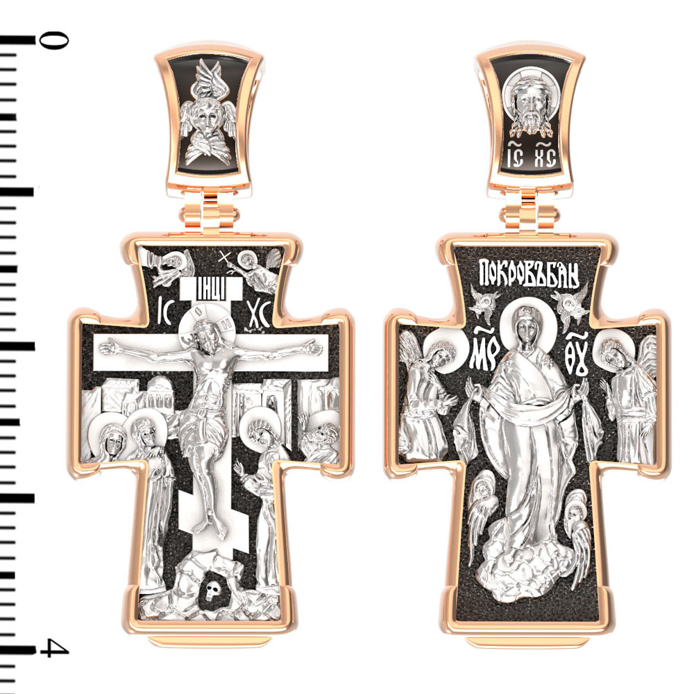 На обороте креста изображена икона Покрова Пресвятой Богородицы. Праздник Покрова Божией Матери является воспоминанием чуда, которое произошло во Влахнернской церкви 1 (14) октября 910 года: Пресвятая Богородица явилась верующим над алтарем храма и распростерла над ними Свое покрывало. В этот день Божия Матерь открыла людям, что Она является Ходатаицей за них перед Богом. Богородица простирает Свой молитвенный покров над всеми православными христианами и умоляет Сына Своего о даровании вечного спасения каждому человеку.