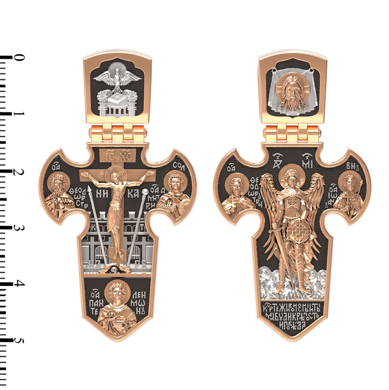 Оборот креста открывается величественной фигурой Архангела Михаила, архистратига Небесного воинства. Его имя означает «Кто яко Бог?», так как он самый могучий и грозный враг зла. С двух сторон от Архистратига Михаила предстоят еще два воина дружины Христовой: великомученик Феодор Тирон и мученик Иоанн Воин. В основании креста молитвенное обращение из Канона, написанного в XIV веке святым монахом Григорием Синаитом: «Кресте Живоносный, ты ми буди крепость и победа». Это молитва воина, восставшего против зла с любовью к ближнему, верой в Бога и надеждой на неизменную помощь Его Небесного Воинства.