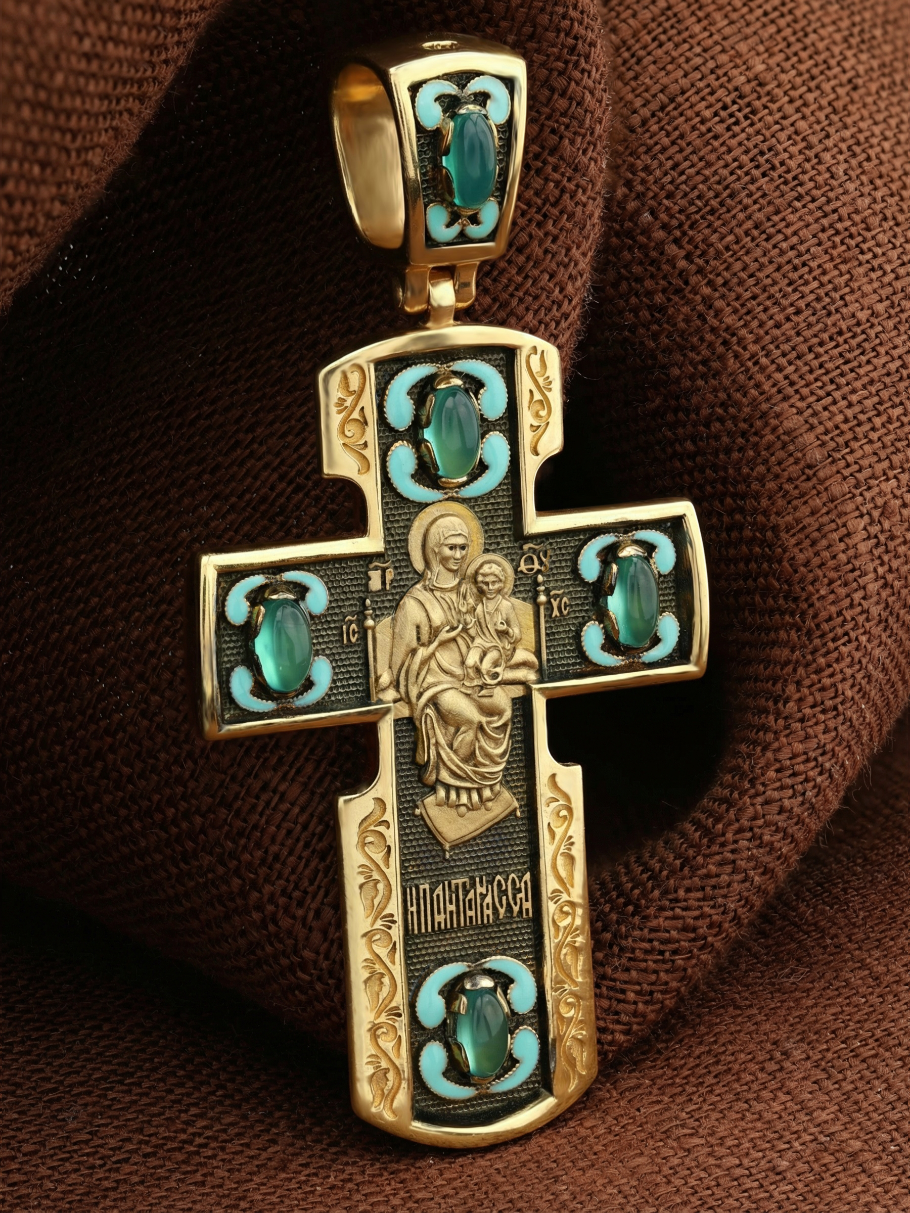 На оборотной стороне креста изображена икона Божией Матери «Всецарица» или «Пантанасса», на которой Пресвятая Богородица восседает на царском троне. На руках Ее — Богомладенец Христос со свитком в левой руке и благословляющий десницей. Правой рукой Богородица указывает на Своего Царственного Сына, как на Спасителя мира. Чудотворная икона была написана в XVII веке и находится на Святой Горе Афон, в одном из древних греческих монастырей — Ватопеде. По молитвам перед иконой совершается множество чудесных исцелений. Пречистая Богородица наставляет на праведный путь, помогает укрепить веру, найти утешение.