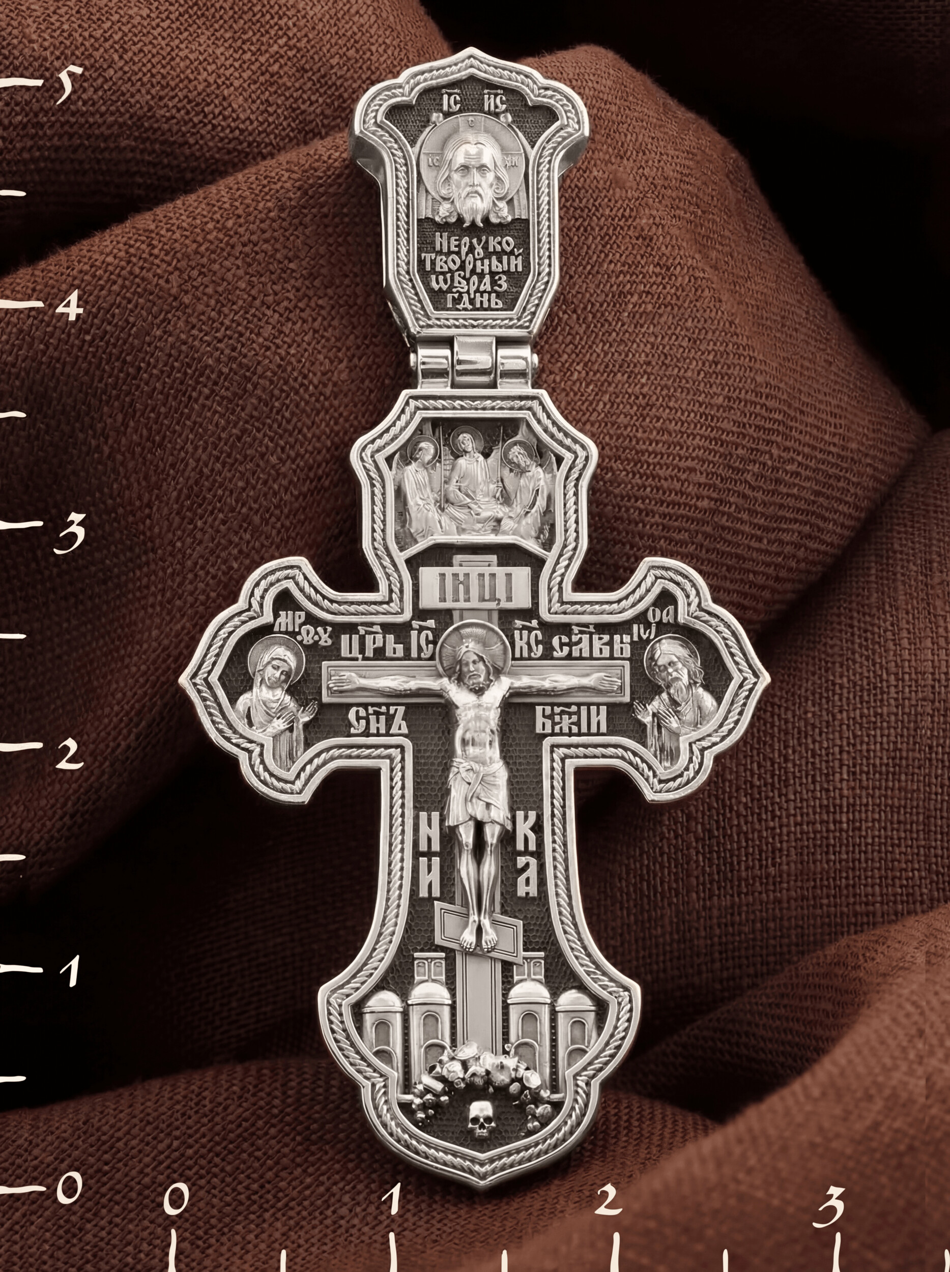 На лицевой стороне креста изображено Распятие Господа и Спасителя нашего Иисуса Христа, отдавшего Себя на смерть, для искупления грехов мира. Крест является символом жертвенной любви Всеблагого Бога к падшим людям, всепобеждающим духовным оружием христиан, основанием и средоточием церковной жизни. Господь сказал: кто хочет идти за Мною, отвергнись себя, и возьми крест свой, и следуй за Мною. (Мк. 8: 34). Над распятием помещена икона Святой Троицы, написанная преподобным Андреем Рублёвым в XV веке. На иконе изображены три ангела, являющихся образом Единосущного и Триипостасного Бога — Святой Троицы. На кулонном кольце изображен Нерукотворный образ Господа и Спасителя нашего Иисуса Христа. На верхней табличке, выше головы Иисуса, расположена надпись, составленная Понтием Пилатом — «IНЦI». Она означает «Иисус Назорей, Царь Иудейский». Надпись «IC» «ХC», означает Иисус Христос, помещается на разных сторонах поперечной перекладины креста. Рядом — слово «НИКА», что означает «победитель» и надпись «Царь Славы». Слева от Распятия изображена Пресвятая Богородица, справа — Про-рок Предтеча и Креститель Господень Иоанн. Ниже расположена надпись «Сын Божий». За крестом высится Иерусалимская стена, в знак того, что Господь был распят вне стен города. Крест стоит на горе камней, символизирующих Голгофу. В ее основании различается череп– это голова Адама.