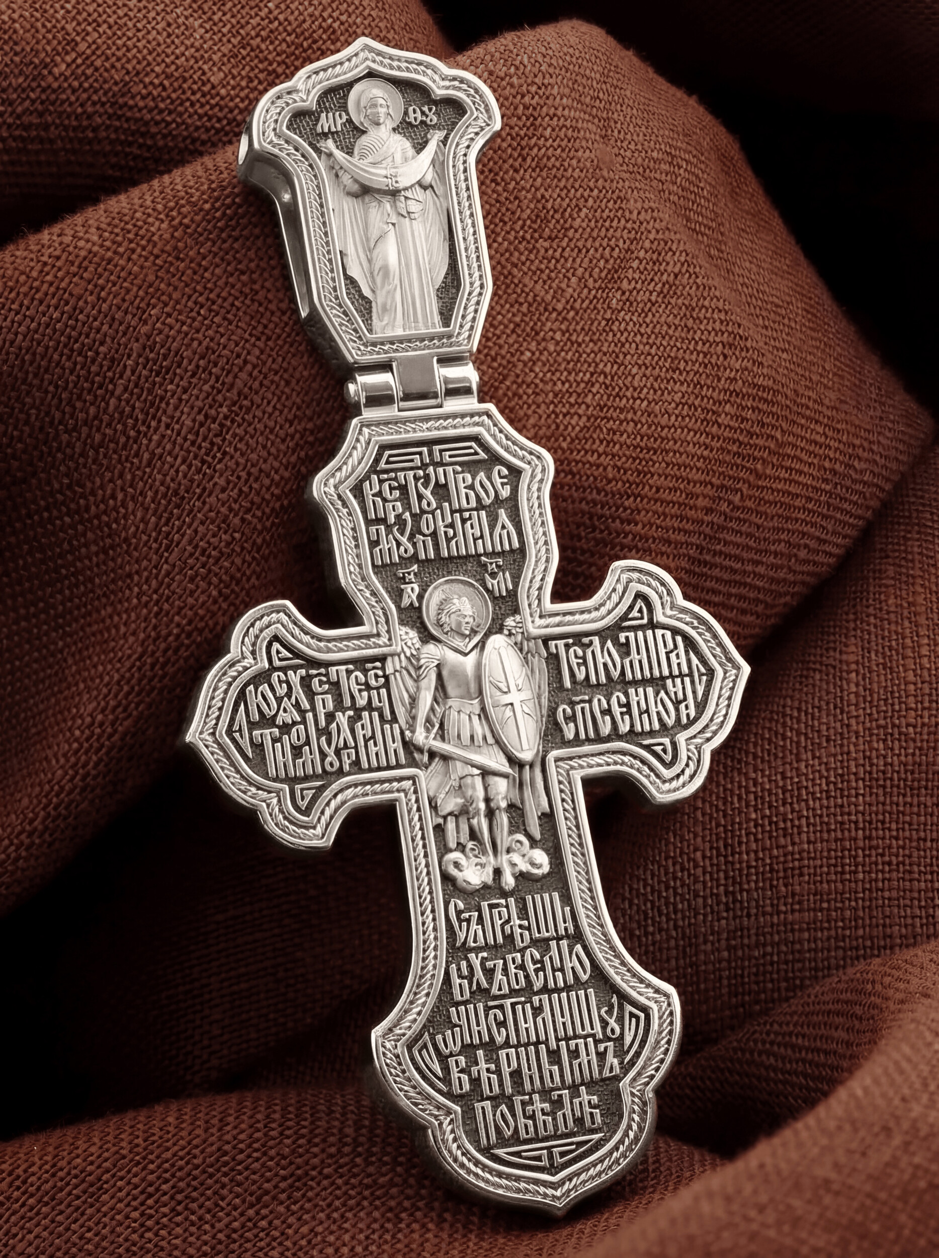 В центре оборотной стороне креста помещен образ Архангела Михаила — верного служителя Божия, который низринул с Неба возгордившегося денницу с другими павшими духами. Он изображен в воинственном виде с огненным мечом в правой руке и щитом в левой. В Православии его называют Архистратигом, что означает глава святого воинства Ангелов и Архангелов. Вокруг образа размещена молитва: «Кресту твоему поклоняемся, Христе, честному хранителю мира, спасения нас грешных, велию очистилищу, верным победе». На кулонной кольце изображена икона Божией Матери «Покров Пресвятой Богородицы». Праздник Покрова Пресвятой Богородицы пришел на Русь в XII веке из Византии и стал одним из самых почитаемых. Богородица простирает Свой молитвенный покров над всеми православными христианами и умоляет Сына своего о даровании вечного спасения каждому человеку.