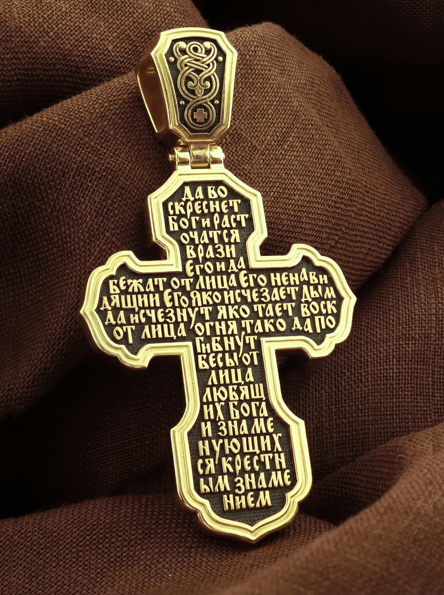 На оборотной стороне креста написана молитва Честному Кресту Господню: «Да воскреснет Бог, и расточатся врази Его, и да бежат от лица Его ненавидящии Его. Яко исчезает дым, да исчезнут; яко тает воск от лица огня, тако да погибнут беси от лица любящих Бога и знаменующихся крестным знамением…».