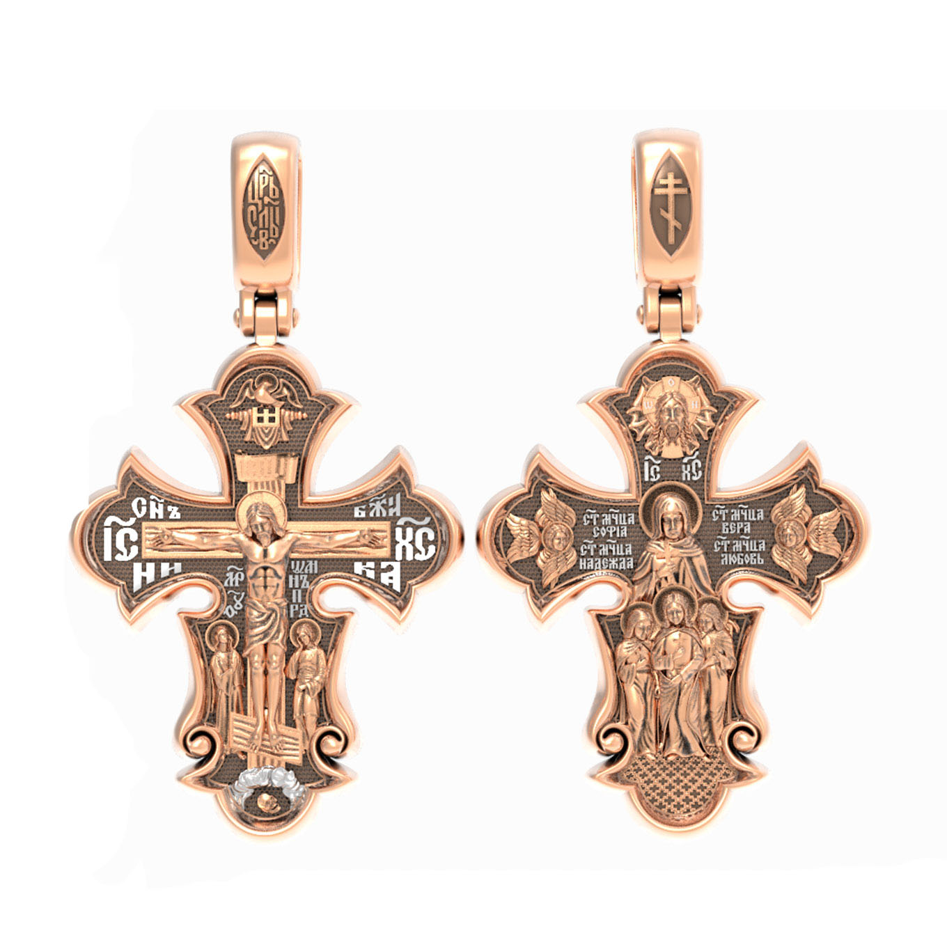 На оборотной стороне креста изображены Святые мученицы Вера, Надежда, Любовь и матерь их София, жившие во 2 веке нашей эры в Римской империи. Известно, что София была родом из Милана. Она рано овдовела, после чего перебралась в Рим. Своих дочерей София воспитывала в христианской вере и даже дала им имена в честь главных христианских добродетелей — Вера, Надежда и Любовь. В те годы римское государство жестоко преследовало верующих во Христа. Маленьких девочек (старшей Вере тогда было всего 12, а младшей Любови лишь 9) арестовали, подвергли истязаниям, а затем умертвили на глазах их матери. Сама София скончалась на следующий день у могилы своих дочерей. Но трагическая судьба на земле обернулась для мучениц вечной славой в ином мире. Церковь причислила их к лику святых и сегодня по молитвам к ним происходят чудеса. Выше образов мучениц изображен Спас Нерукотворный — образ Господа и Спасителя нашего Иисуса Христа, чудесно отпечатавшийся на плате, котором Христос вытер свой лик. По обеим сторонам креста изображены Ангелы Серафимы. На кулонном кольце помещен крест.