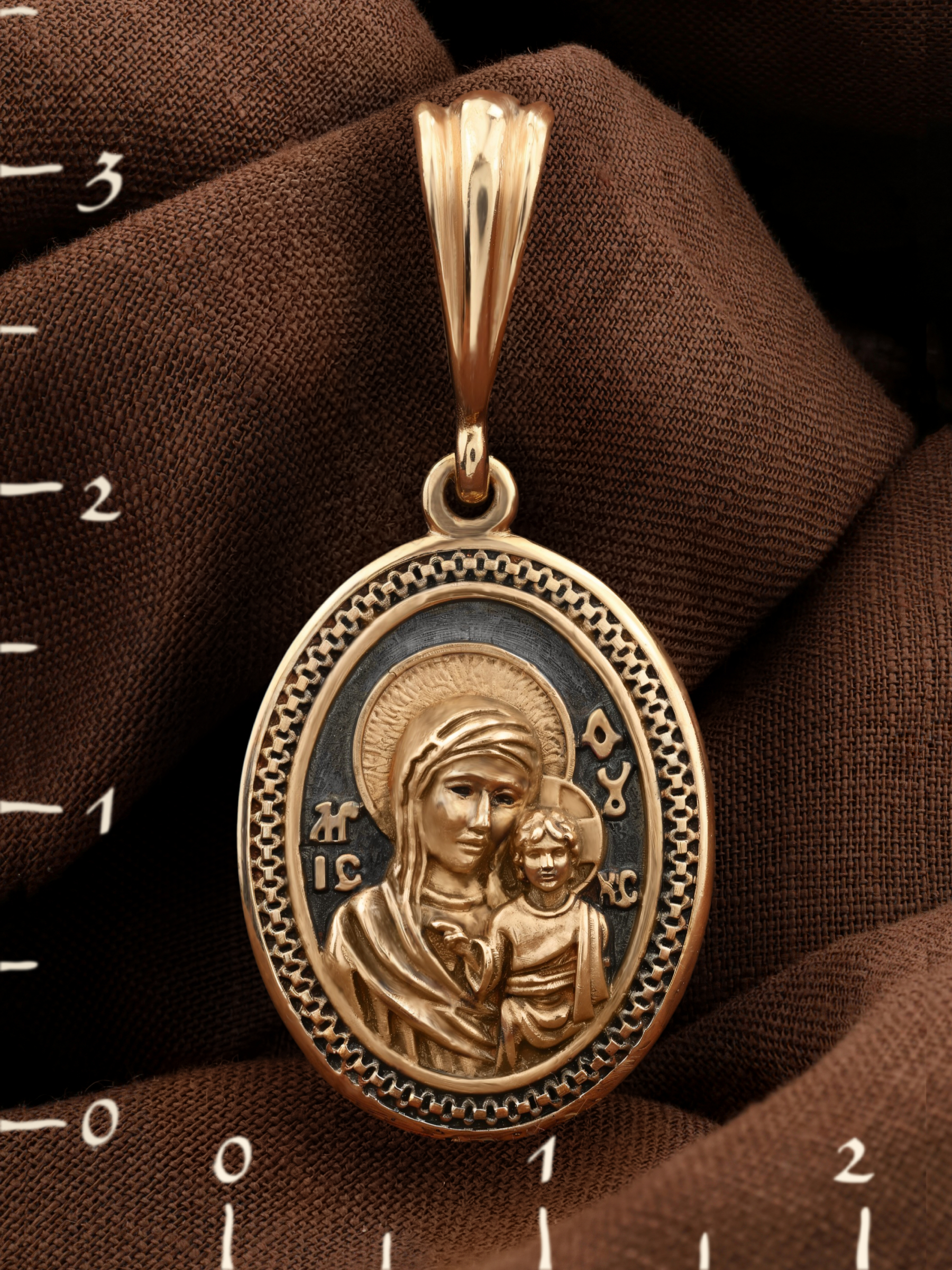 На лицевой части образка изображена Казанская икона Пресвятой Богородицы — одна из самых почитаемых в России. Икона была явлена на пожарище в Казани в 1579 году. В 1904 году святыня была похищена и уничтожена, но чудотворную силу иконы Богородица явила во многих ее списках. Молитва перед Казанской иконой Божьей Матери помогает во всех сложных случаях жизни, во всех печалях, невзгодах, скорбях.