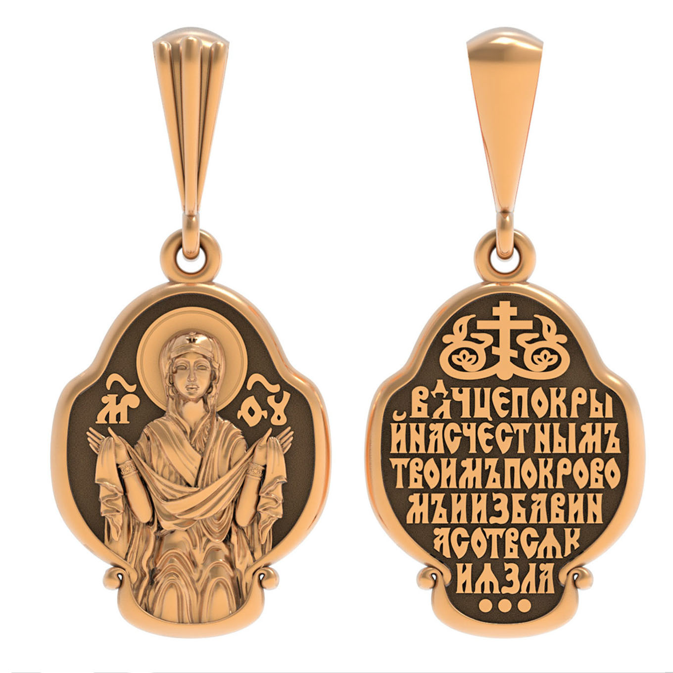 На лицевой части образка изображена икона Покров Пресвятой Богородицы. Праздник Покрова Божией Матери является воспоминанием чуда, которое произошло во Влахнернской церкви 1 (14) октября 910 года: Пресвятая Богородица явилась верующим над алтарем храма и распростерла над ними Свое покрывало. В этот день Божья Матерь открыла людям, что Она является Ходатаицей за них перед Богом. Богородица простирает Свой молитвенный покров над всеми православными христианами и умоляет Сына Своего о даровании вечного спасения каждому человеку.