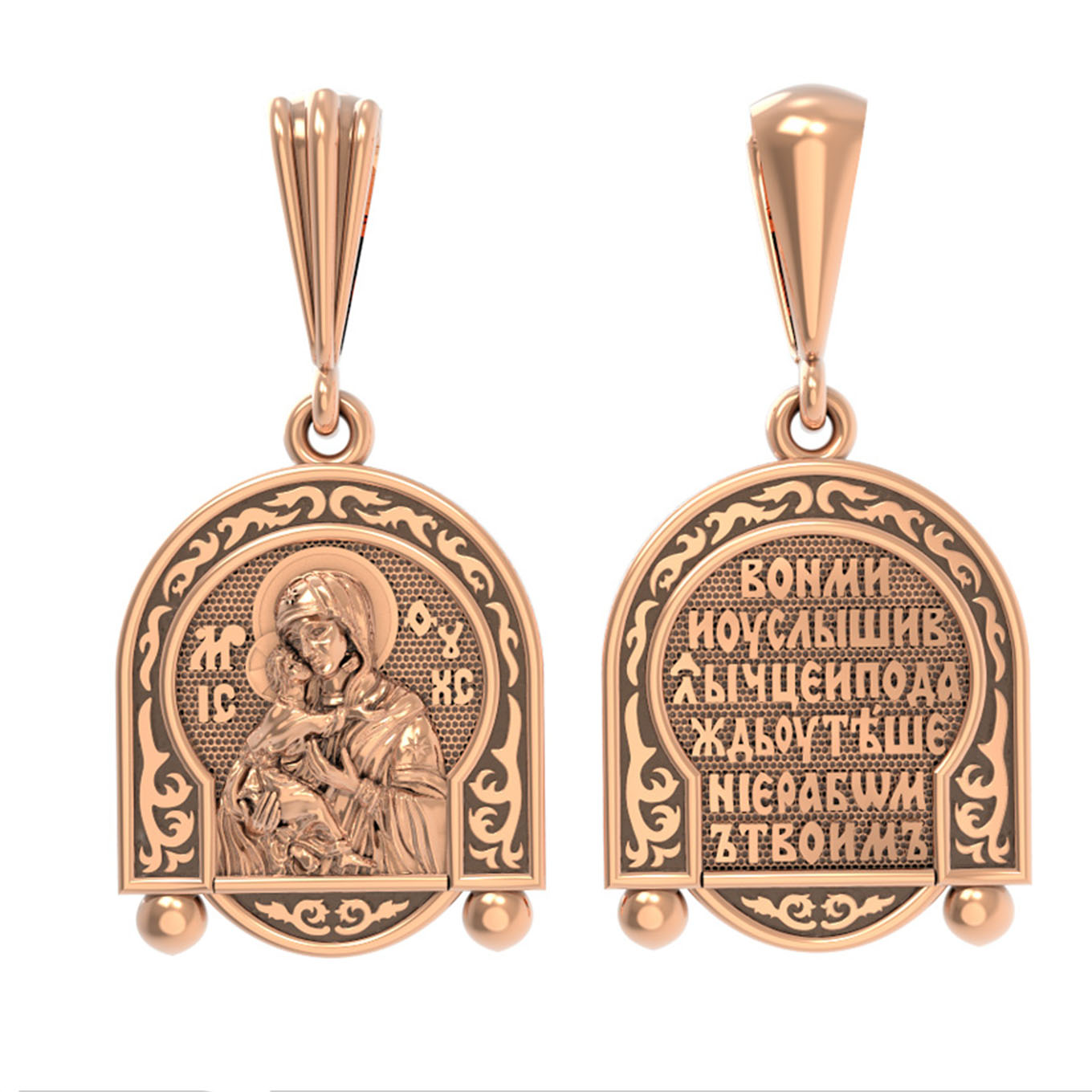 Лицевую сторону возглавляет Владимирская икона Божией Матери — самая великая русская святыня, многие века бывшая олицетворением нашей земли. Перед ней венчались на царство государи, избирались патриархи. Пречистой Богородице Владимирской клялись в верности Отечеству солдаты и за нее умирали на поле брани. Именно на ее защиту более всего уповала Россия в самые страшные периоды своей истории. Владимирская икона Божией Матери, по преданию, была написана на доске трапезного стола из дома Иисуса Христа. На Русь она была привезена в начале XII века и с тех пор почитается как главная святыня нашего Отечества. Перед ней молитвенно просят Богородицу об исцелении от телесных недугов, в частности, заболеваний сердца и сердечнососудистой системы. За помощью к ней обращаются во время бедствий, когда нуждаются в защите от врагов.