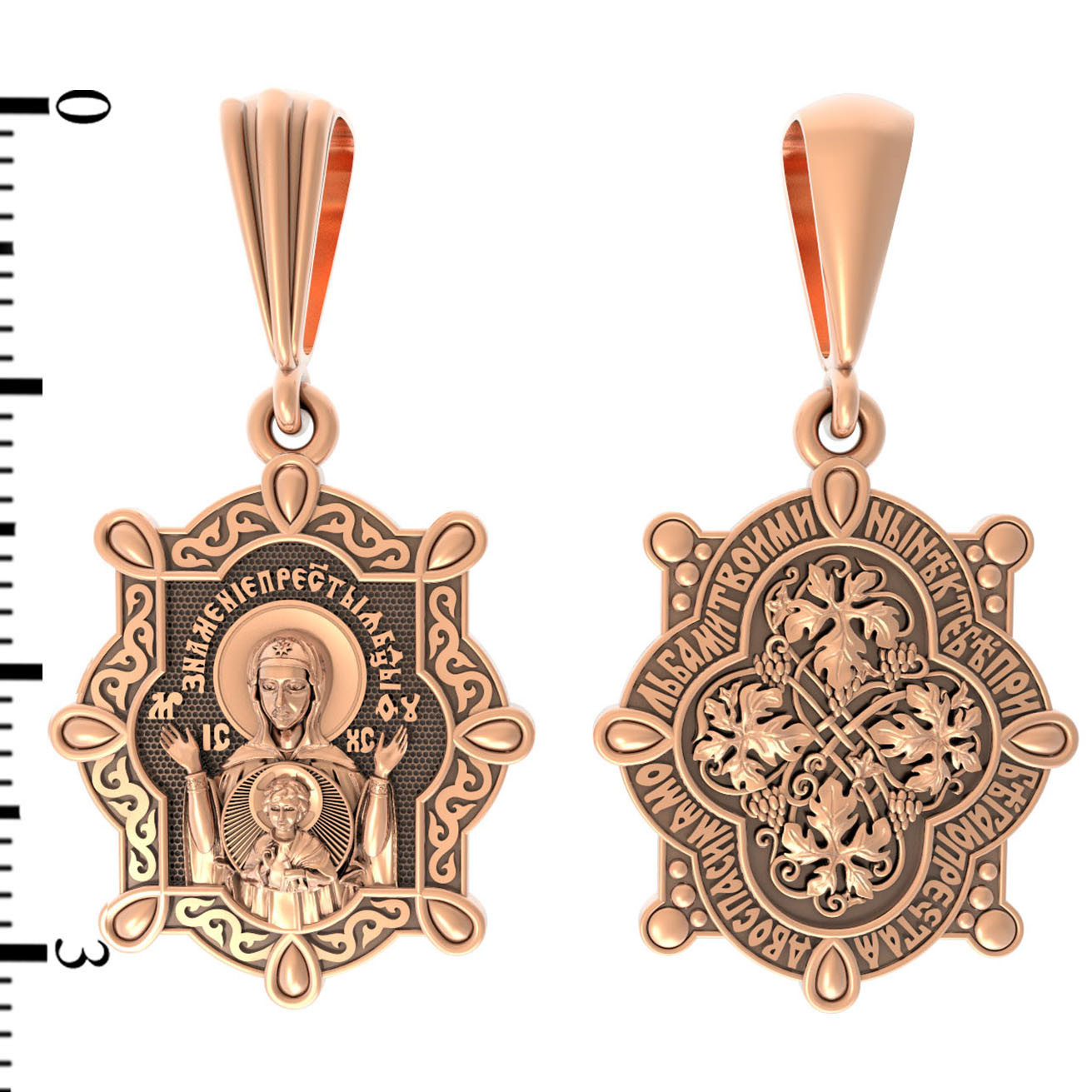 В центр образка помещен образ Божией Матери «Знамение», прославившийся многими чудесами в Новгороде в XII веке. Икона эта чтится как одна из самых великих святынь Русской земли. Молитвенно воздетые руки Богородицы означают заступничество за людей пред Богом. Рядом с Ней, на фоне круглого щита, — благословляющий Божественный Младенец — Спас-Эммануил.