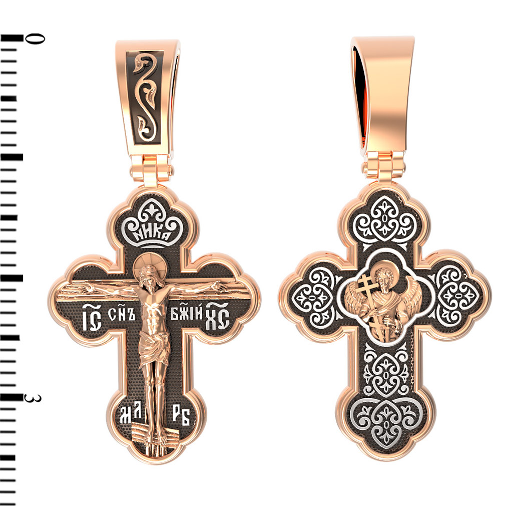 Крест нательный четырехконечный с трехлепестковыми завершениями перекладин. На лицевой стороне креста изображено Распятие, потому что это орудие казни Иисус Христос сделал орудием победы над грехом и смертью. Своими страданиями Он искупил грехи человечества, умерев и сошествовав во ад, победил сатану, освободил души праведников от вечной смерти и открыл им небесные врата рая. Жертва Христа сделала возможным спасение для каждого человека. На православном кресте Христос не умирает, а свободно простирает руки, ладони Иисуса открыты, будто он хочет обнять все человечество, даря им свою любовь и открывая путь к вечной жизни. Над головой Христа надпись — «НИКА» (греч. — Победитель). С обеих сторон горизонтальной перекладины надписи — монограмма святого имени Христа — «ИС ХС», а рядом с ней словосочетание «СНЪ БЖIЙ» — «СЫН БОЖИЙ». Две пары букв на кресте «МЛ» «РБ» означают: Место Лобное Рай Бысть. Возвышение, на котором стоит Крест, символизирует гору Голгофу, на которой произошло Распятие. У подножия Креста изображают прах Адама, обозначенный черепом.