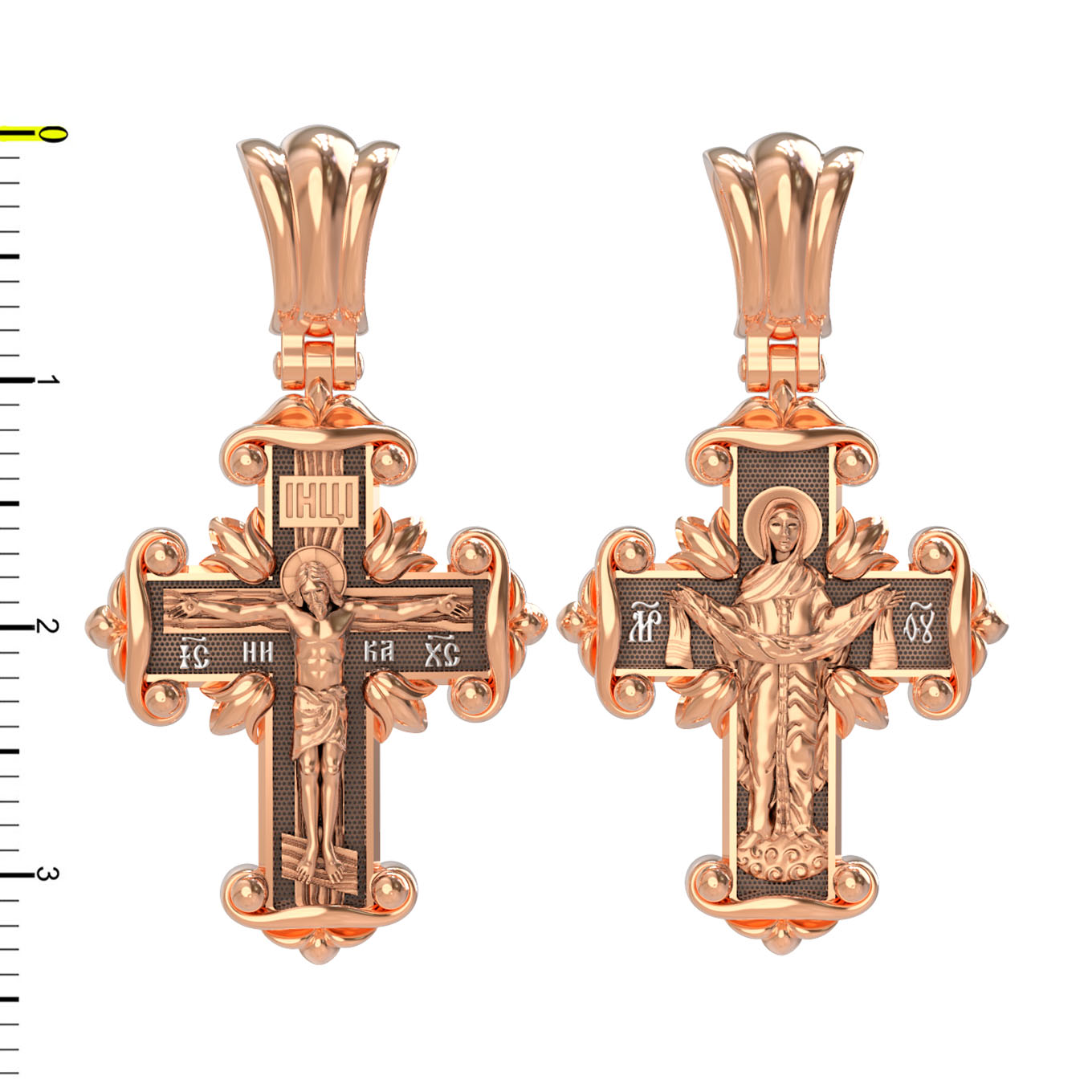 На оборотной стороне креста изображена икона Божией Матери «Покров Пресвятой Богородицы». Праздник Покрова Пресвятой Богородицы пришел на Русь в XII веке из Византии и стал одним из самых почитаемых. В 910 году Византийской Империи угрожали нападением сарацины. Не видя ниоткуда помощи, в те дни греки во множестве стекались в Константинополь, во Влахернский храм, в котором хранились риза Богоматери и Ее головной покров, и молились. 1 (14) октября 910 года Святому Андрею Юродивому и его ученику Епифанию было видение Покрова Божией Матери. Пресвятая Богородица, в окружении Святых, явилась над алтарем Храма и слезно молилась. По окончании молитвы сняла с Себя блистающее великое и страшное покрывало, которое носила на Пречистой главе Своей и, держа его с великой торжественностью, распростерла над всем стоящим народом. Вскоре враги без всякого кровопролития отступили от города. Богородица простирает Свой молитвенный покров над всеми православными христианами и умоляет Сына своего о даровании вечного спасения каждому человеку.