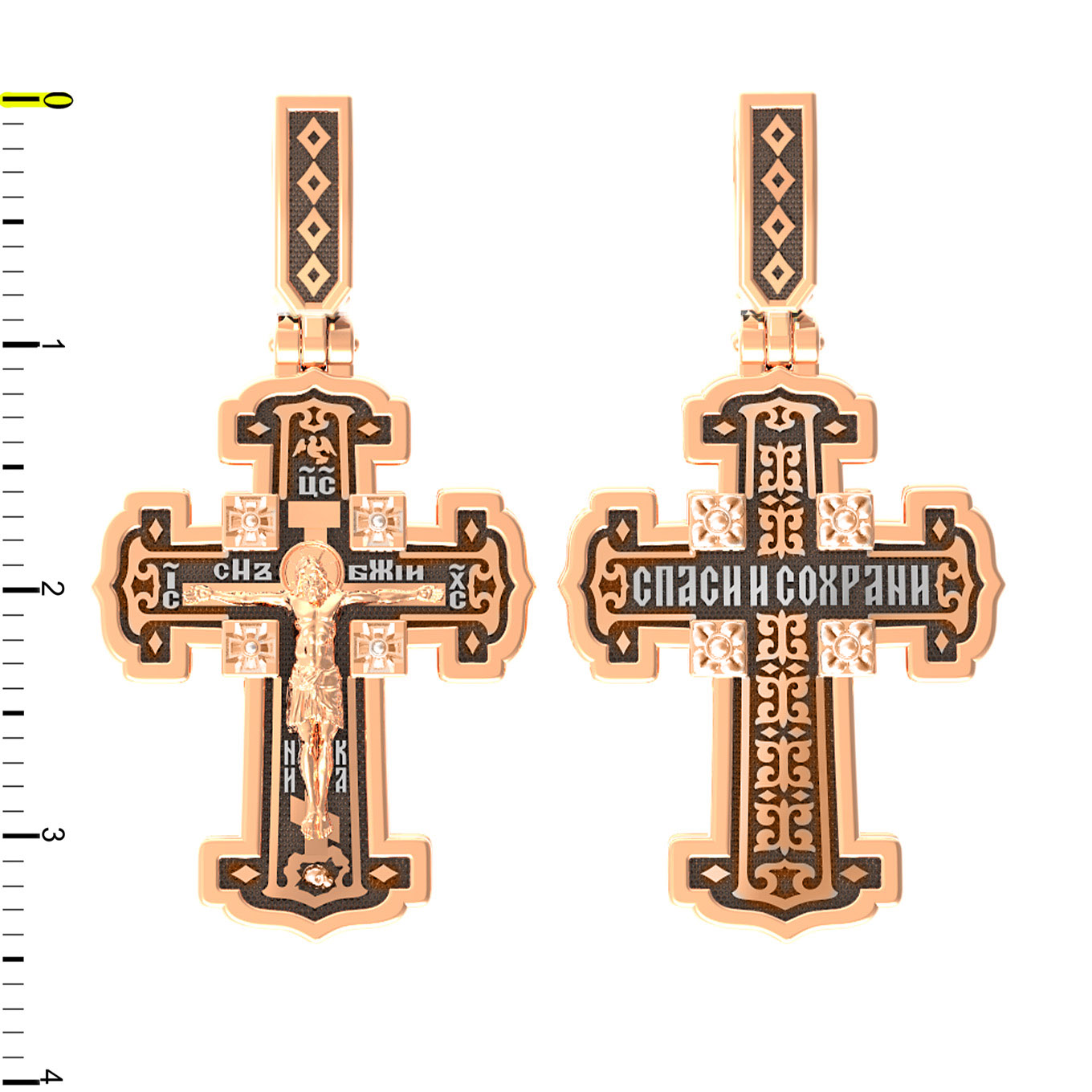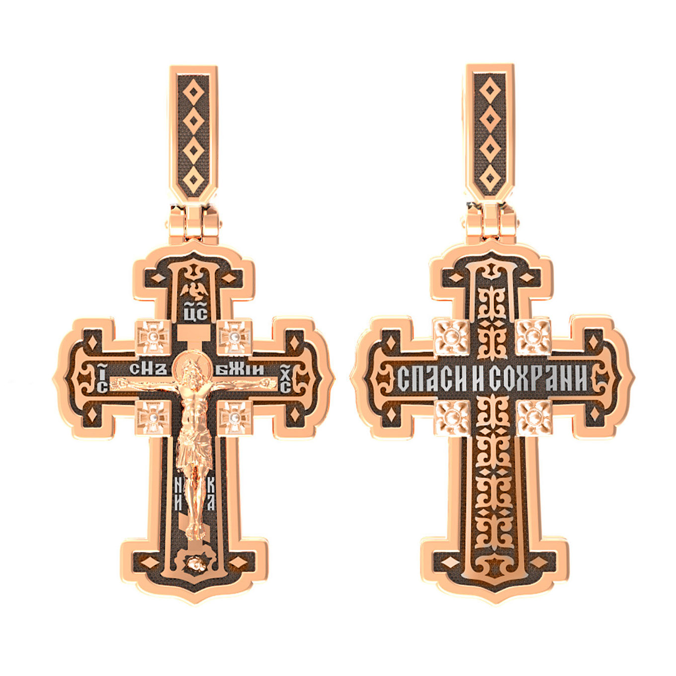На лицевой стороне креста изображено Распятие Господа и Спасителя нашего Иисуса Христа. В Голгофе сокрыта непостижимая тайна бесконечной правды и любви Бога. Крест стал символом победы добра над злом, жизни над смертью, напоминанием бесконечной Божьей любви, предметом радости. Воплотившийся Сын Божий Своею кровью освятил крест и сделал его проводником Своей благодати, источником освящения верующих. Над вершиной Распятия помещена надпись «Царь Славы» и изображение Духа Святого в виде голубя, сходящего с небес. Надпись «IС» « ХС» означает Иисус Христос и помещается на разных сторонах поперечной перекладины креста. Рядом расположена надпись «Сын Божий». Слово «НИКА», что означает «победитель», помещаются в нижней части креста. Крест стоит на горе камней, символизирующих Голгофу. В ее основании различается череп — это голова Адама. На православном кресте Христос не умирает, а свободно простирает руки, ладони Иисуса открыты, будто он хочет обнять все человечество, даря им свою любовь и открывая путь к вечной жизни.