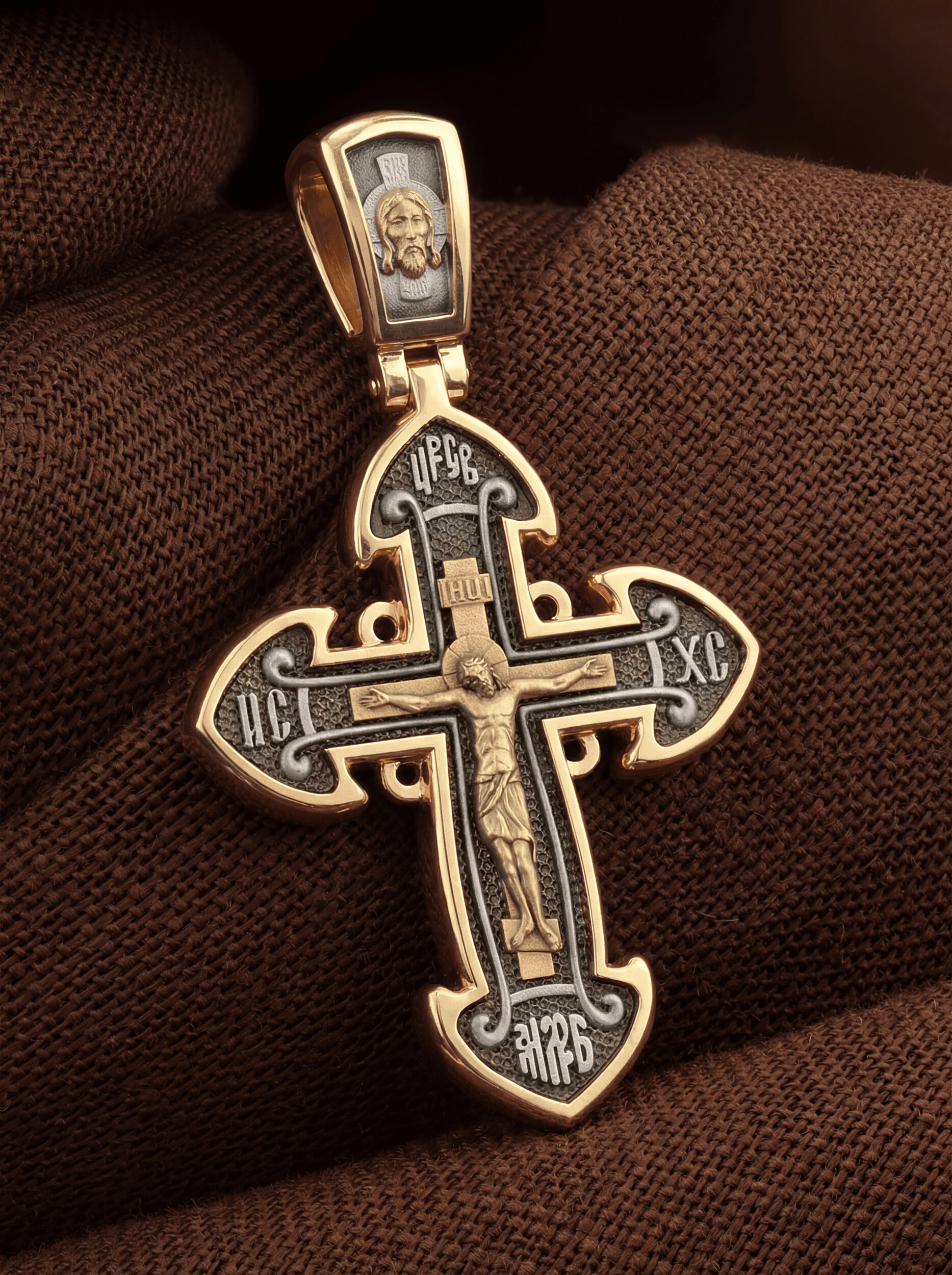 Традиционно на лицевой стороне этого креста изображено Распятие. Это связано с тем, что любой нательный крест в первую очередь символизирует крестные страдания Христа, Его смерть и Воскресение. Поэтому древний вид Распятия являет вознесенного на Крест Сына Божия не просто прибитого к кресту, а словно простирающего руки и призывающего в Свои объятия весь мир. Сохраняя образ страдания Христа, такой вид Распятия в то же время удивительно точно передает его духовный смысл. Христос, распятый и умерший, изображен живым в самой Своей смерти. С двух сторон раскинутых рук Христа написаны инициалы Его имени — «ИС ХС». Сверху над Распятием размещена надпись «Царь Славы», а у подножия Господа видна аббревиатура «МЛ РБ» (Место Лобное Рай Бысть), символизирующая гору Голгофу.