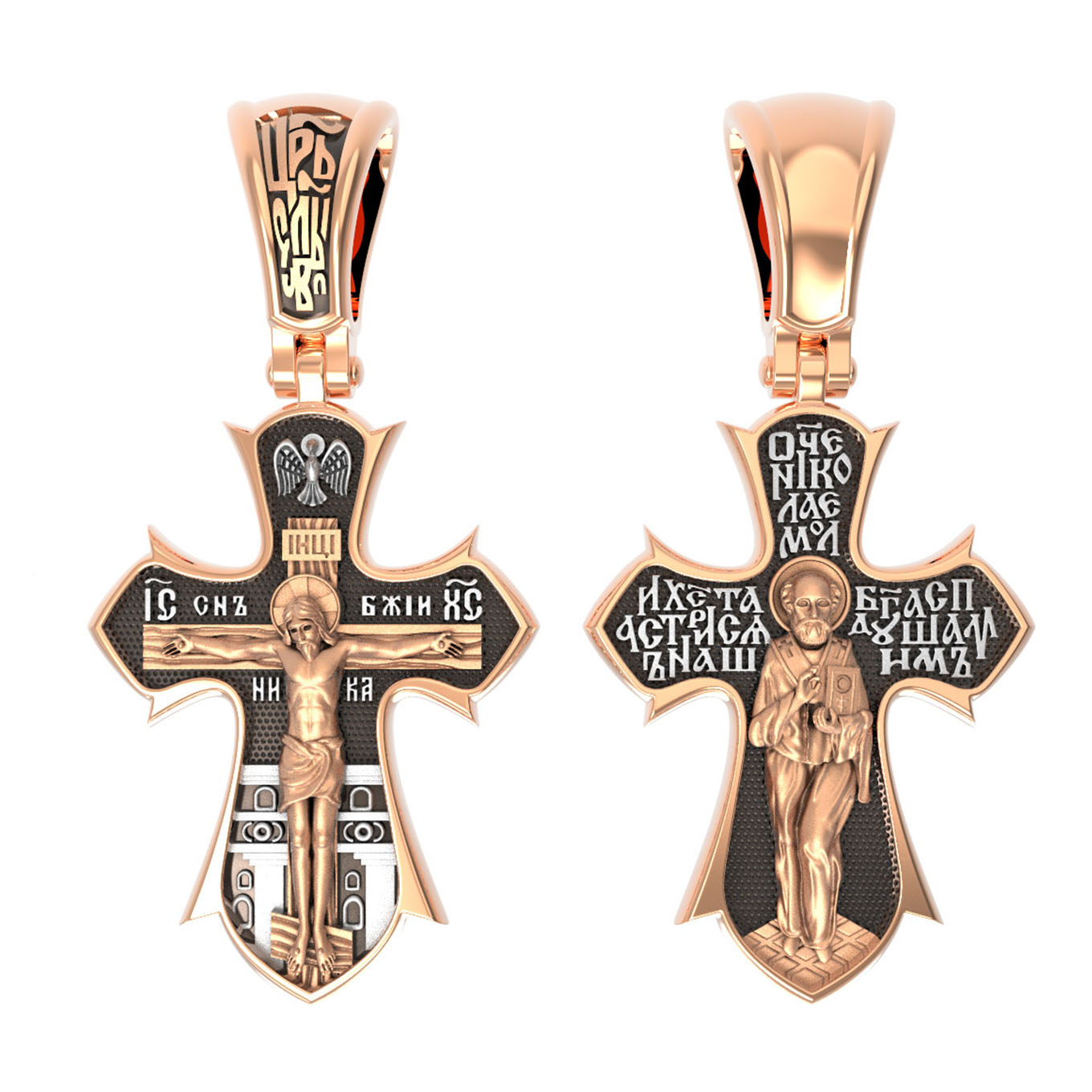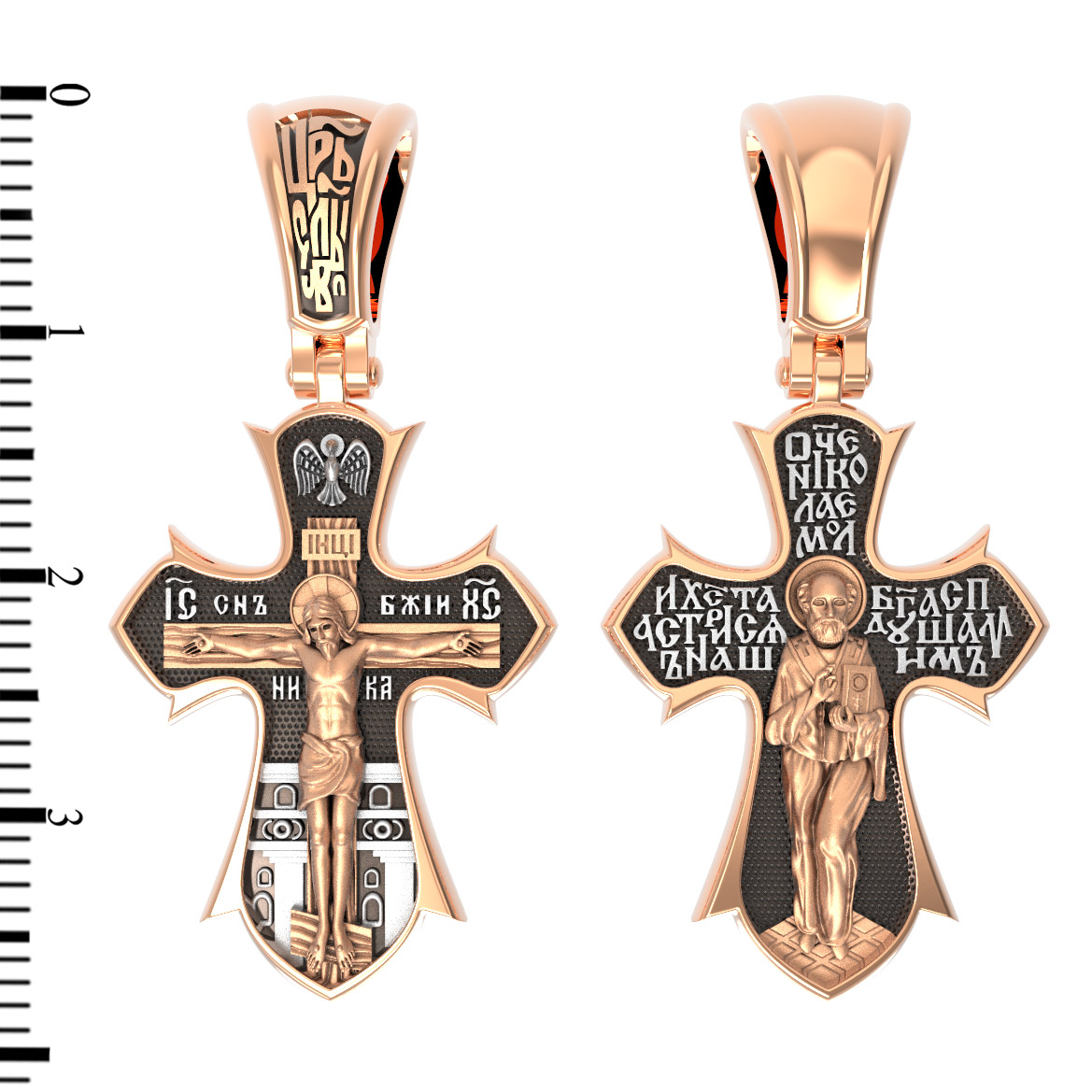 Оборотную сторону креста возглавляет икона Святителя Николая Чудотворца, которого еще называют Николай Угодник за то, что он угодил своей жизнью Богу. Николай Чудотворец, помощник в делах, покровитель учащихся, утешитель обиженных. Также Святитель Николай Чудотворец известен своими молитвами за путешественников, когда непрестанный ветер и бушующие волны утихают и корабль заходит в спокойную гавань. На кресте написана молитва: «Отче Николае, моли Христа Бога спастися душам нашим».