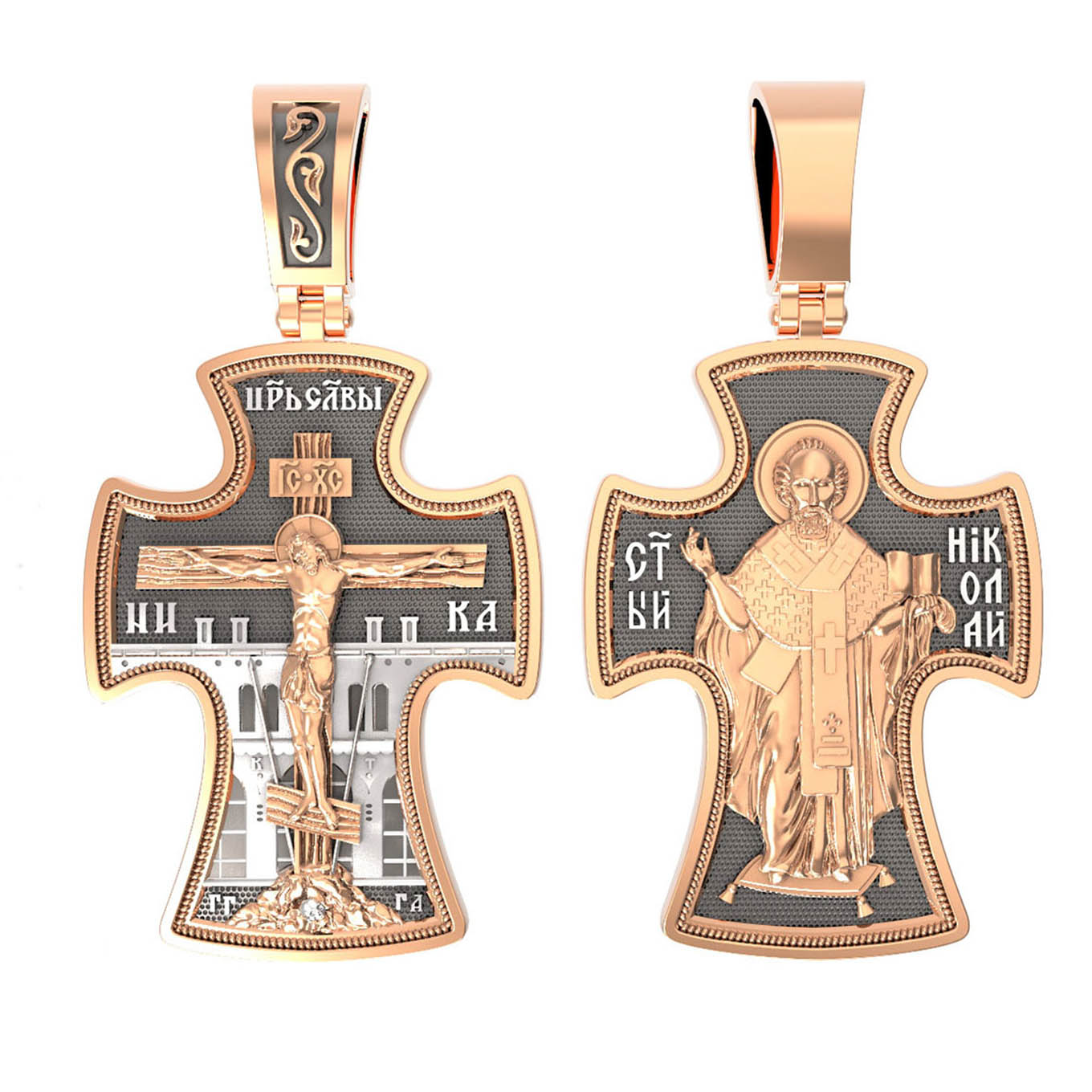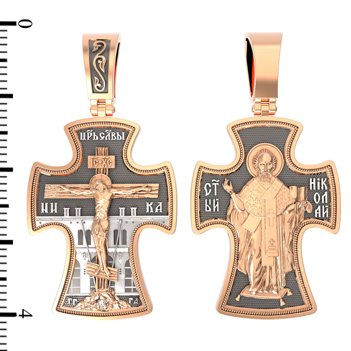 Оборотную сторону креста возглавляет икона святителя Николая Чудотворца. Живший в III веке епископ Ликийского города Миры — самый почитаемый святой не только в России, но и во всем мире. Николай Чудотворец, помощник в делах, защитник путешествующих, покровитель учащихся, утешитель обиженных и нуждающихся, целитель самых страшных и тяжелых недугов, предстатель и молитвенник за людей перед Богом.