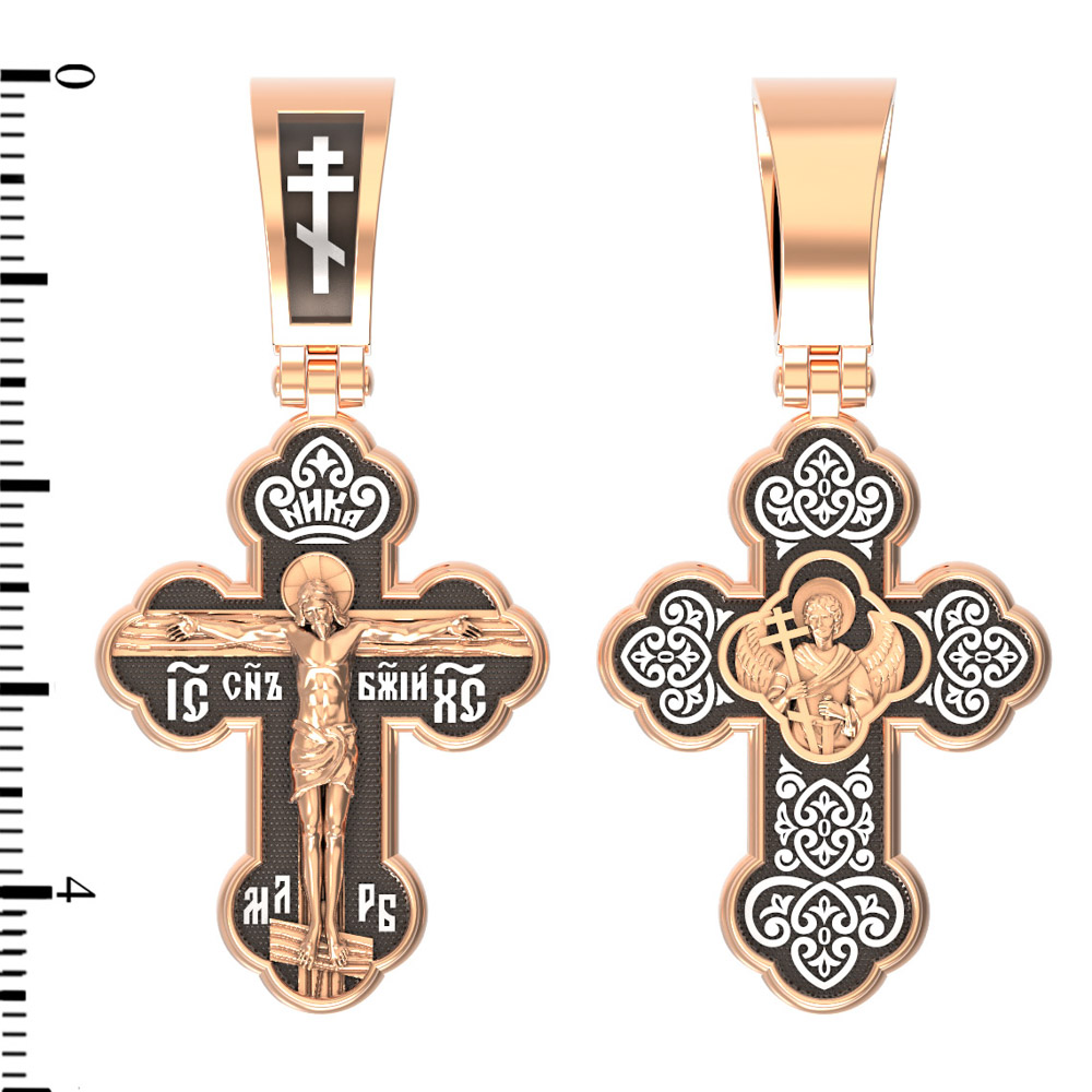 Крест нательный четырехконечный с трехлепестковыми завершениями перекладин. Основой композиции лицевой стороны креста является Распятие Иисуса Христа. С обеих сторон горизонтальной перекладины надписи — монограмма святого имени Христа — «ИС ХС», а под ней «Сын Божий». Над головой Христа надпись — «НИКА» (Победитель). В подножии мы видим изображенную гору Голгофу в виде скалистой горки, а так же буквы «МЛ» «РБ», которые означают: «Место Лобное Рай Бысть». Крест, на котором Спаситель мира принес Искупительную жертву, открыл врата рая, затворившиеся после грехопадения Адама. Поэтому Лобное место (Голгофа) стало раем.