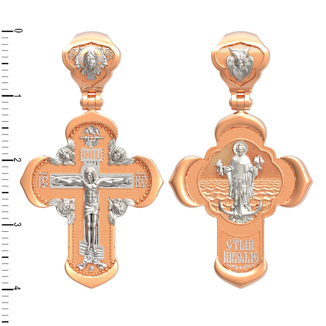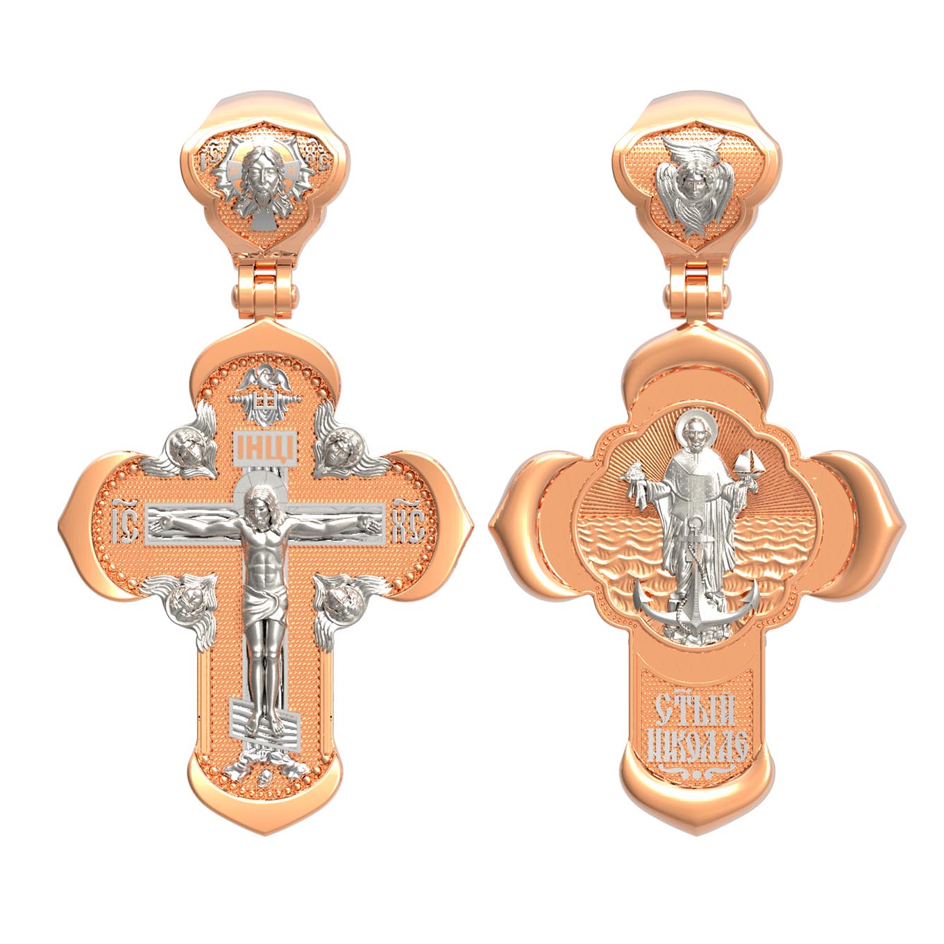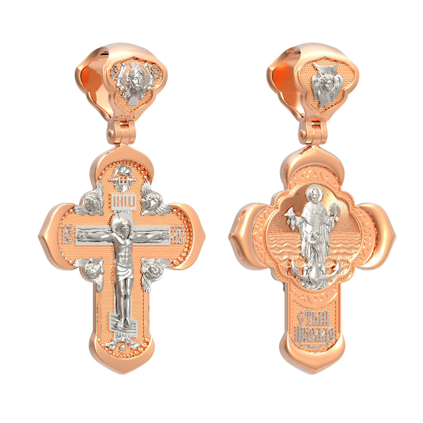 На лицевой стороне креста изображено Распятие Господа и Спасителя нашего Иисуса Христа, отдавшего Себя на смерть, для искупления грехов мира. Крест является символом жертвенной любви Всеблагого Бога к падшим людям, всепобеждающим духовным оружием христиан, основанием и средоточием церковной жизни. Господь сказал: «кто хочет идти за Мною, отвергнись себя, и возьми крест свой, и следуй за Мною». (Мк. 8: 34). На верхней табличке, выше головы Иисуса, расположена надпись, составленная Понтием Пилатом — «IНЦI». Она означает «Иисус Назорей, Царь Иудейский». Надпись «IC» «ХC», означает Иисус Христос, помещается на разных сторонах поперечной перекладины креста. Крест стоит на горе камней, символизирующих Голгофу. В ее основании различается череп– это голова Адама. На кулонном кольце изображен Нерукотворный образ Господа и Спасителя нашего Иисуса Христа, чудесно отпечатавшийся на плате, которым Христос вытер свой лик.