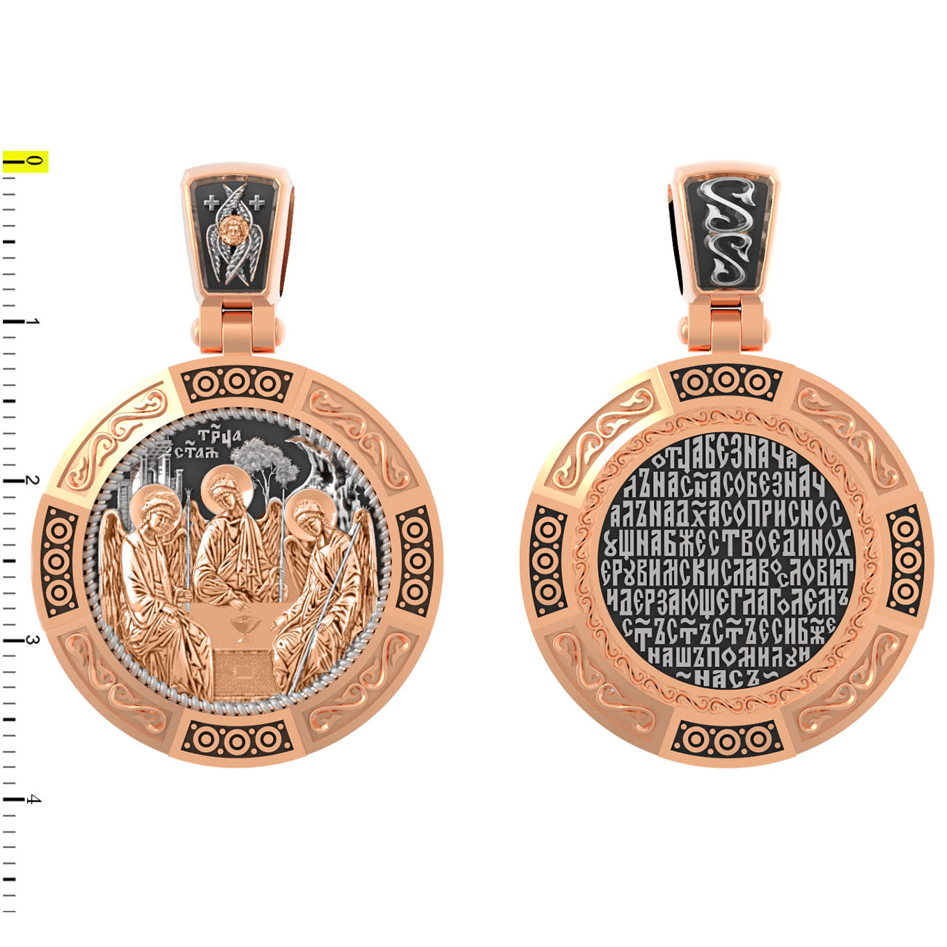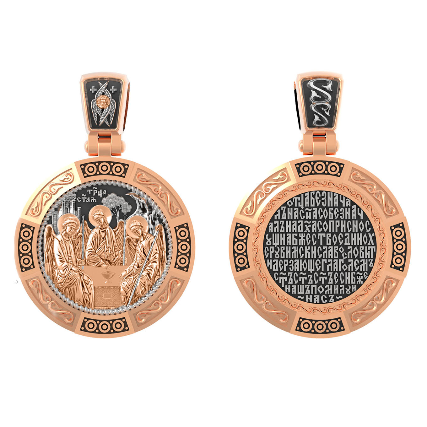 На лицевой стороне изображена икона Святой Троицы. Это образ Триединого Бога явившегося в виде трех Ангелов праотцу Аврааму. Ангелы сидят за трапезным столом вокруг чаши, которая символизирует грядущую жертву Второго Лица Пресвятой Троицы, Бога Сына.