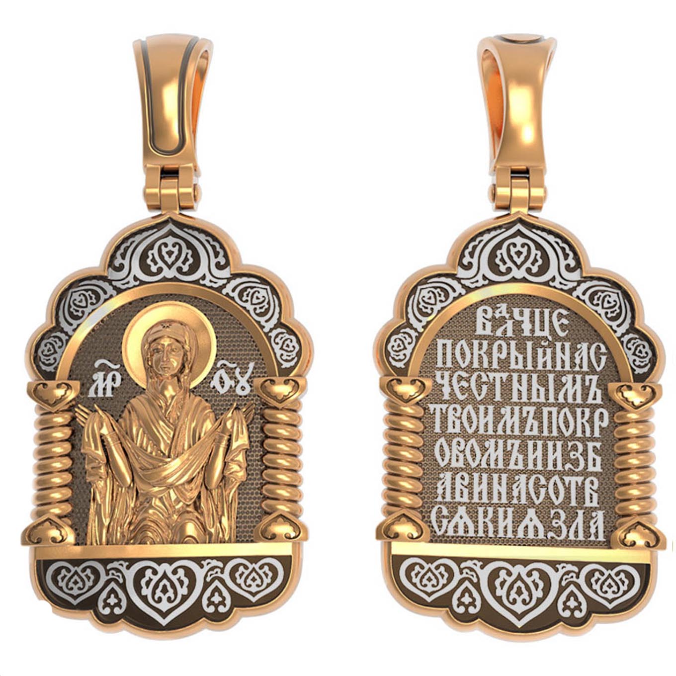 На лицевой части образка изображена икона Покров Пресвятой Богородицы. Праздник Покрова Божией Матери является воспоминанием чуда, которое произошло во Влахнернской церкви 1 (14) октября 910 года: Пресвятая Богородица явилась верующим над алтарем храма и распростерла над ними Свое покрывало. В этот день Божья Матерь открыла людям, что Она является Ходатаицей за них перед Богом. Богородица простирает Свой молитвенный покров над всеми православными христианами и умоляет Сына Своего о даровании вечного спасения каждому человеку