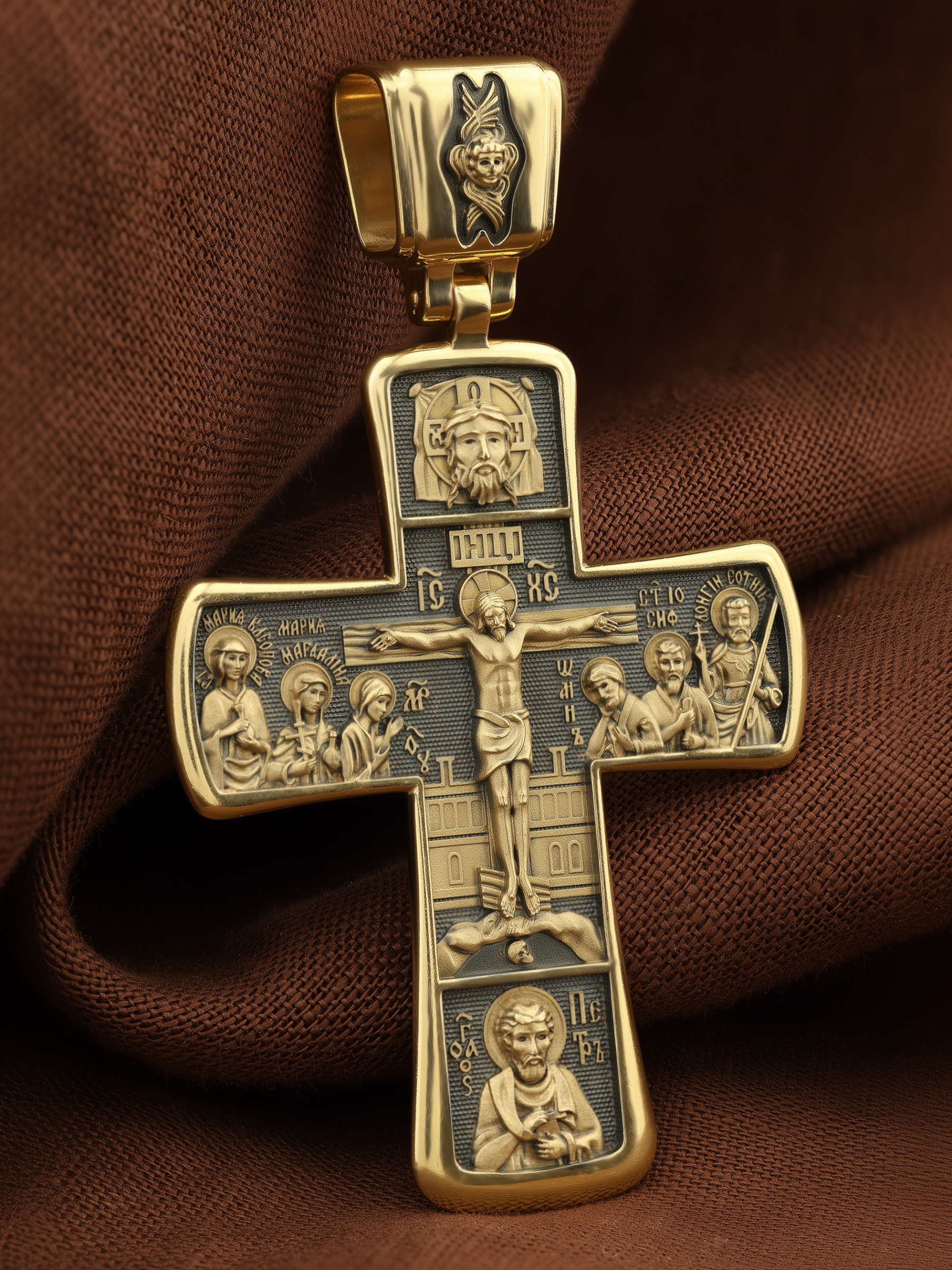На лицевой стороне креста изображено Распятие Господа Иисуса Христа с предстоящими Ему святыми, которые, по преданию, находились у Креста Господа во время Его казни. Слева — Пресвятая Богородица и жены-мироносицы — равноапостольная Мария Магдалина и святая Мария Клеопова, справа — апостол Иоанн Богослов, прав. Иосиф Аримофейский и мч. Лонгин Сотник.