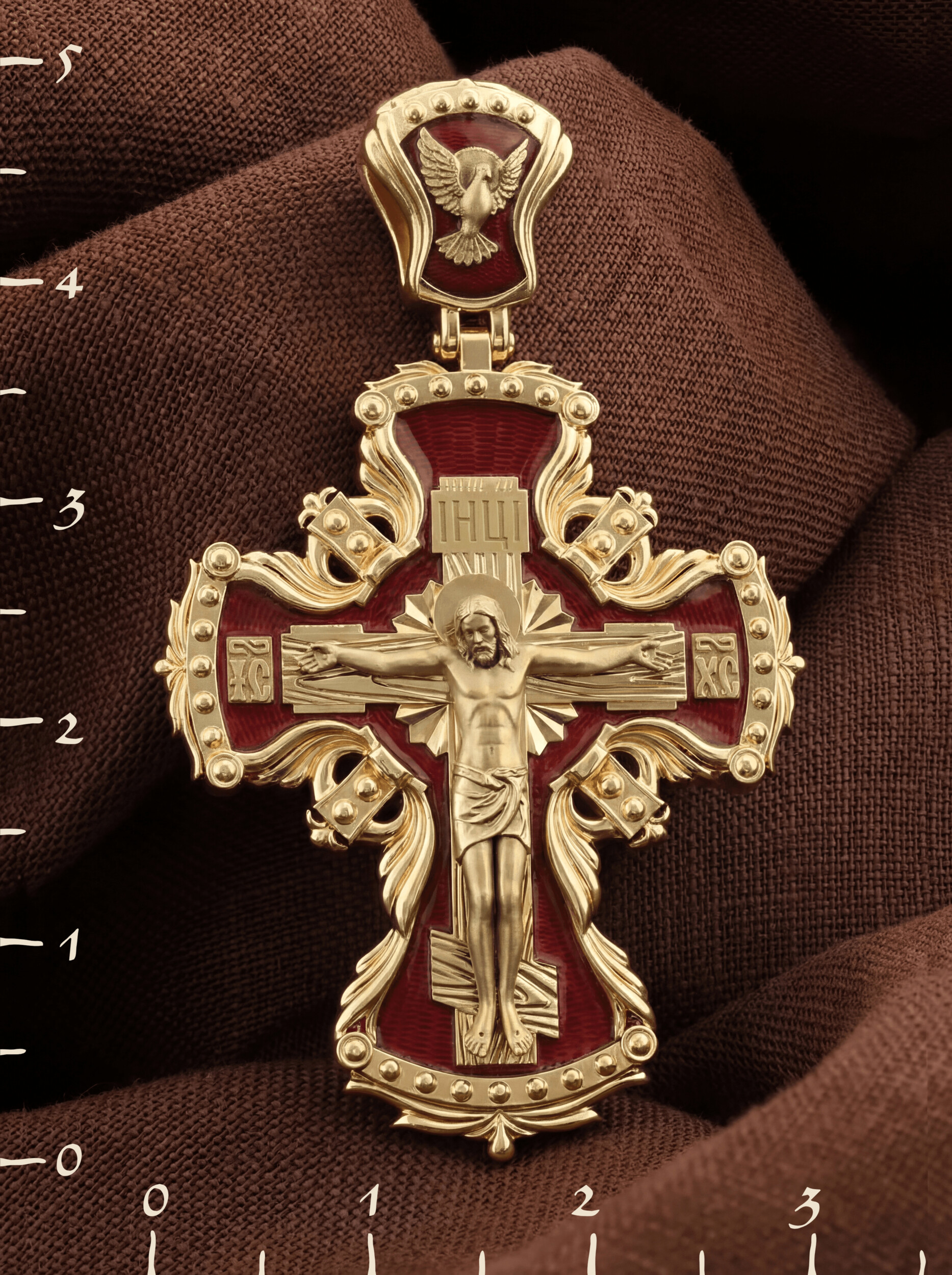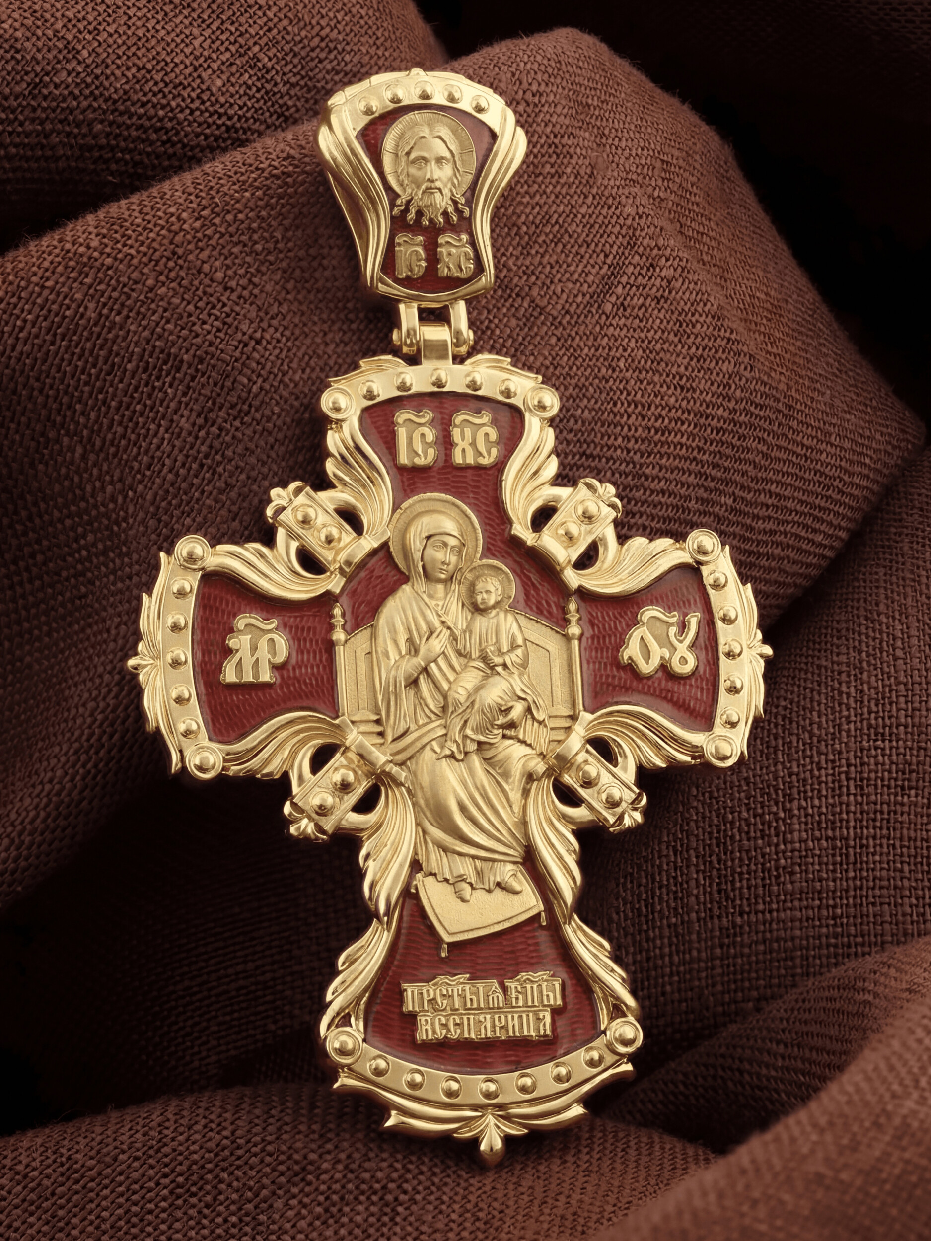 Центральную часть лицевой стороны занимает Распятие Христа — образ жертвы, принесенной Господом за грехи людей. Именно ко Христу, сошедшему на землю ради нашего спасения, возносятся все молитвы. Рядом с Его образом помещены слова — «НИКА» и «СЫН БОЖИЙ». Эти слова характеризуют Господа как Великого Архиерея, победителя смерти. Также Распятие сопровождается надписями, олицетворяющими Христа — это святое имя Христа «IC» (Иисус) «ХС» (Христос). На кулонном кольце изображен голуь — символ Святого Духа.