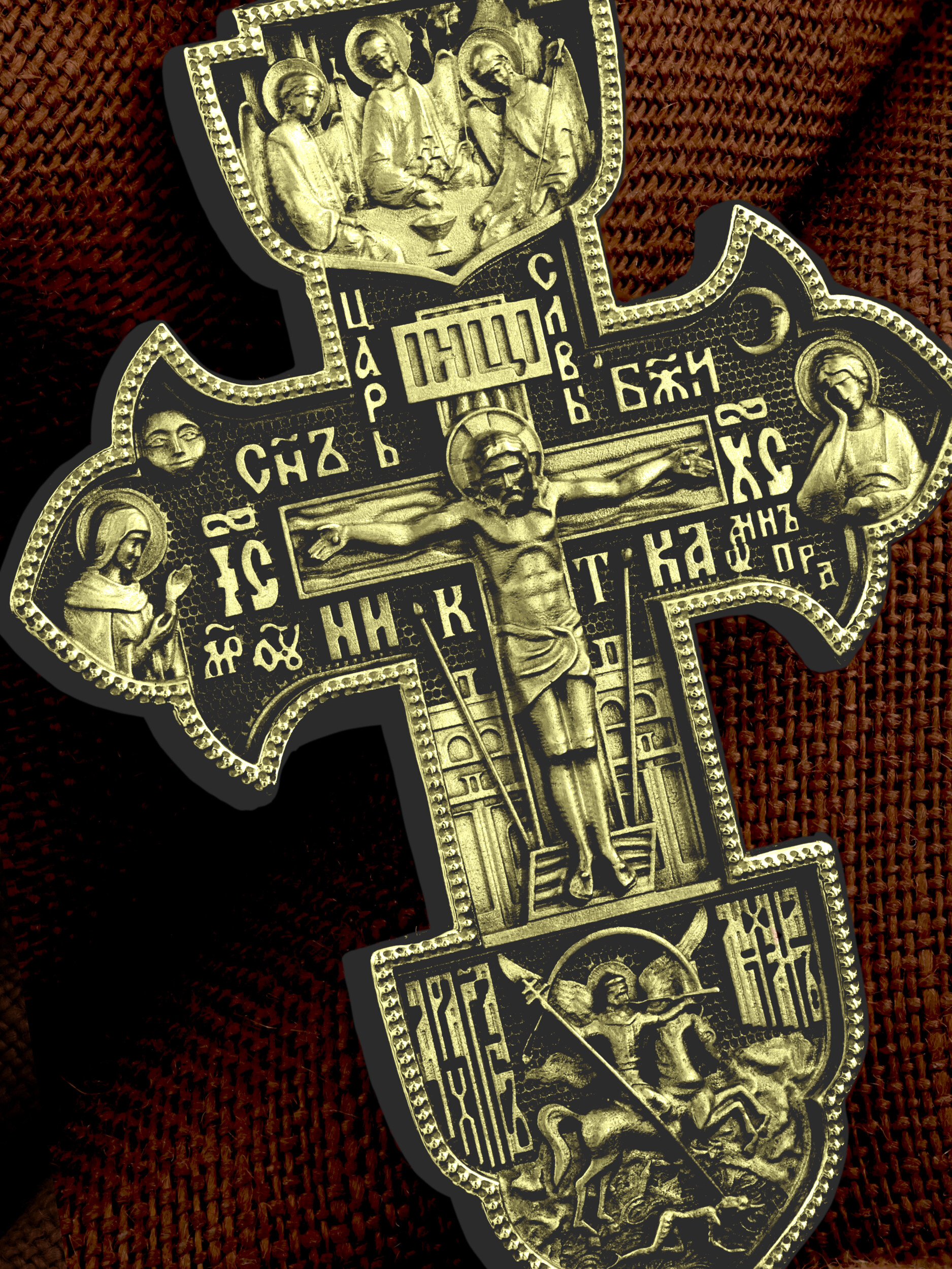 На лицевой стороне креста изображено Распятие Господа и Спасителя нашего Иисуса Христа. Крест- символ спасения и искупления рода человеческого, знамение победы над смертью и адом. Иисус Христос, как искупительная жертва освобождения человечества от власти греха, умер крестной смертью и в третий день воскрес. На верхней табличке, выше головы Иисуса, расположена надпись, составленная Понтием Пилатом — «IНЦI». Она означает «Иисус Назорей, Царь Иудейский». Распятие сопровождается каноническими надписями. Над Распятием находится надпись «Царь Славы». Надпись «IС» « ХС» означает Иисус Христос и помещается на разных сторонах поперечной (большой) перекладины креста. Рядом расположены надпись «Сын Божий» и слово «НИКА», что означает «победитель». Слева от Распятия изображена Пресвятая Богородица, справа — апостол и евангелист Иоанн Богослов, один из ближайших учеников Иисуса Христа. За Распятием высится Иерусалимская стена, в знак того, что Господь был распят вне стен города. Вдоль креста изображены копие сотника Лонгина и трость с губкой и буквы «К» и «Т». Рядом — слово «НИКА», что означает «победитель». Над распятием помещено изображение иконы Святой Троицы в виде трех ангелов. Ниже распятия изображен Архангел Михаил, восседающим на огненном крылатом коне. От уст архангела исходит труба, возвещающая наступление Второго пришествия и Страшного суда, а над его распростертыми крыльями изображена радуга. Копьем с крестом он пронзает поверженного сатану. На кулонном кольце изображен Нерукотворный образ Господа и Спасителя нашего Иисуса Христа, чудесно отпечатавшийся на плате, котором Христос вытер свой лик.