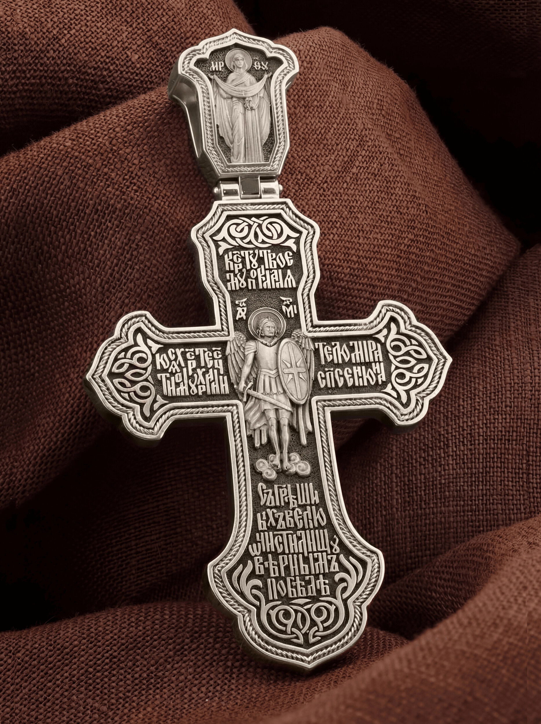 В центре оборотной стороне креста помещен образ Архангела Михаила — верного служителя Божия, который низринул с Неба возгордившегося денницу с другими павшими духами. Он изображен в воинственном виде с огненным мечом в правой руке и щитом в левой. В Православии его называют Архистратигом, что означает глава святого воинства Ангелов и Архангелов. Вокруг образа размещена молитва: «Кресту твоему поклоняемся, Христе, честному хранителю мира, спасения нас грешных, велию очистилищу, верным победе». На кулонной кольце изображена икона Божией Матери «Покров Пресвятой Богородицы». Праздник Покрова Пресвятой Богородицы пришел на Русь в XII веке из Византии и стал одним из самых почитаемых. Богородица простирает Свой молитвенный покров над всеми православными христианами и умоляет Сына своего о даровании вечного спасения каждому человеку.