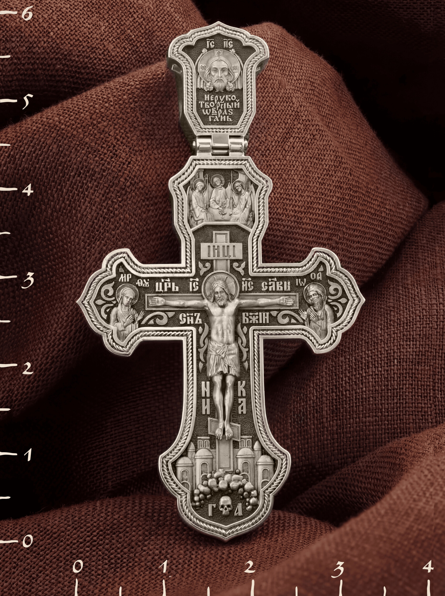 На лицевой стороне креста изображено Распятие Господа и Спасителя нашего Иисуса Христа, отдавшего Себя на смерть, для искупления грехов мира. Крест является символом жертвенной любви Всеблагого Бога к падшим людям, всепобеждающим духовным оружием христиан, основанием и средоточием церковной жизни. Господь сказал: кто хочет идти за Мною, отвергнись себя, и возьми крест свой, и следуй за Мною. (Мк. 8: 34). Над распятием помещена икона Святой Троицы, написанная преподобным Андреем Рублёвым в XV веке. На иконе изображены три ангела, являющихся образом Единосущного и Триипостасного Бога — Святой Троицы. На кулонном кольце изображен Нерукотворный образ Господа и Спасителя нашего Иисуса Христа. На верхней табличке, выше головы Иисуса, расположена надпись, составленная Понтием Пилатом — «IНЦI». Она означает «Иисус Назорей, Царь Иудейский». Надпись «IC» «ХC», означает Иисус Христос, помещается на разных сторонах поперечной перекладины креста. Рядом — слово «НИКА», что означает «победитель» и надпись «Царь Славы». Слева от Распятия изображена Пресвятая Богородица, справа — Про-рок Предтеча и Креститель Господень Иоанн. Ниже расположена надпись «Сын Божий». За крестом высится Иерусалимская стена, в знак того, что Господь был распят вне стен города. Крест стоит на горе камней, символизирующих Голгофу. В ее основании различается череп– это голова Адама.