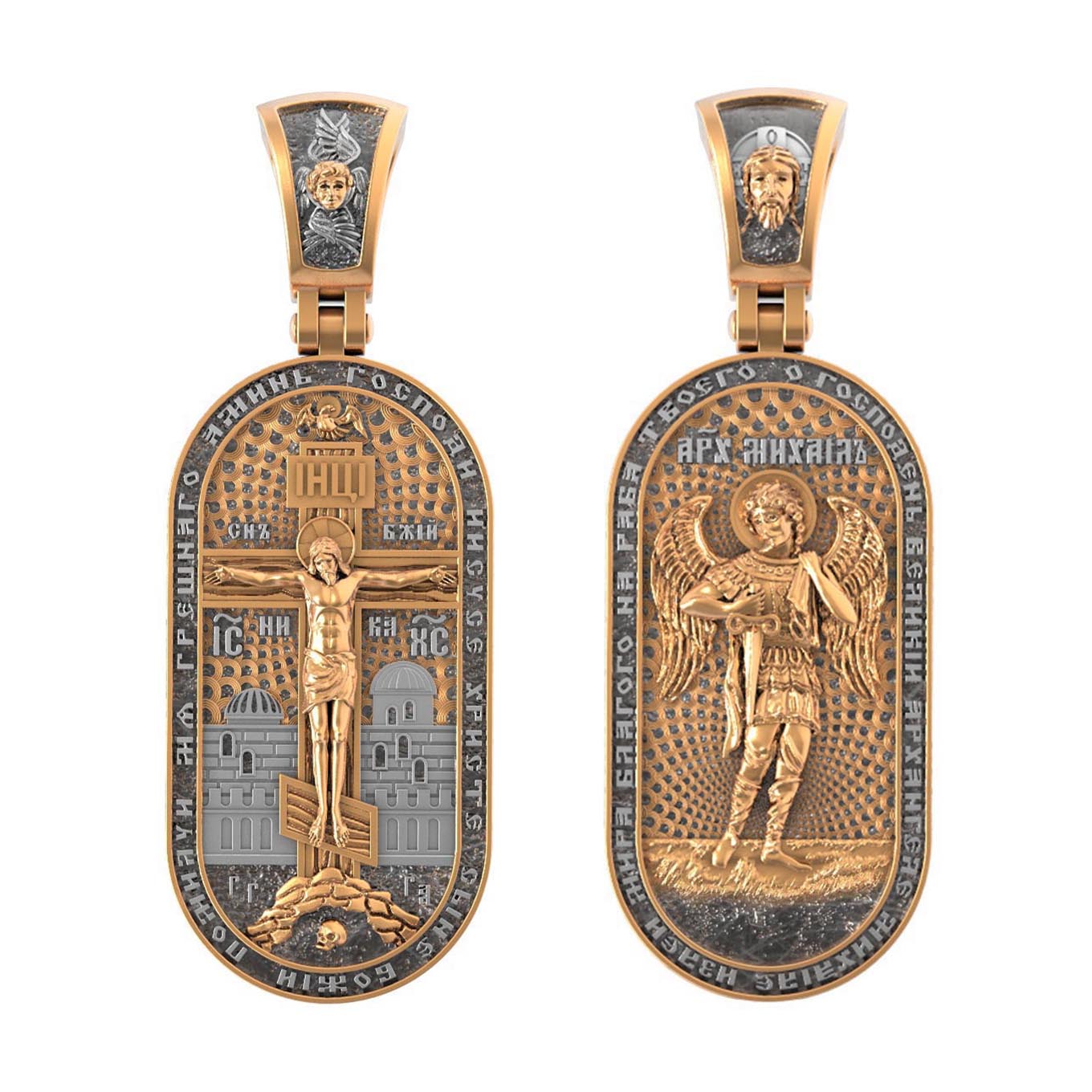 Основой композиции оборотной стороны является ростовое изображение Архангела Михаила — Архистратига всех Небесных Воинств. Он ведет непримиримую войну против сил зла, охраняет райские врата и защищает души людей. По контуру написана молитва: «О, Господень Великий Архангеле Михаиле, излей мира благого на раба Твоего». На кулонном кольце изображен Спас Нерукотворный — Символ вочеловечившегося Божества.