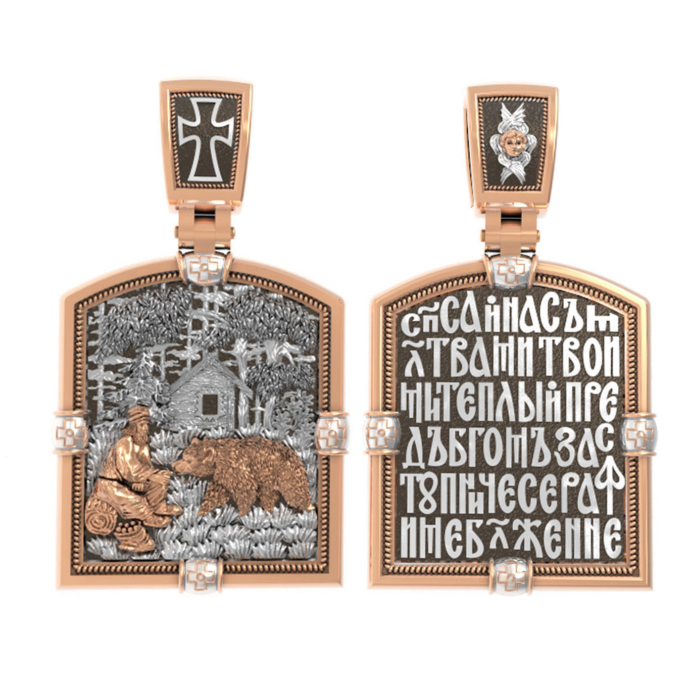 На лицевой стороне образка изображен Преподобный Серафим Саровский, самый великий русский святой XIX века. Преподобный Серафим почитается за особую милостивую любовь к людям и неоскудевающую помощь во всяких делах.