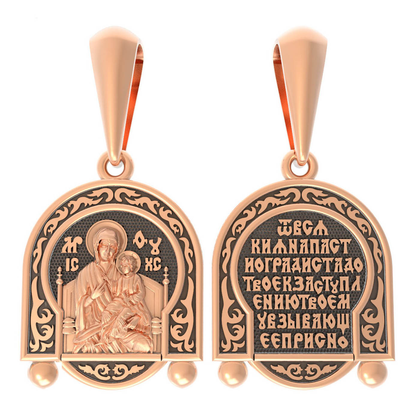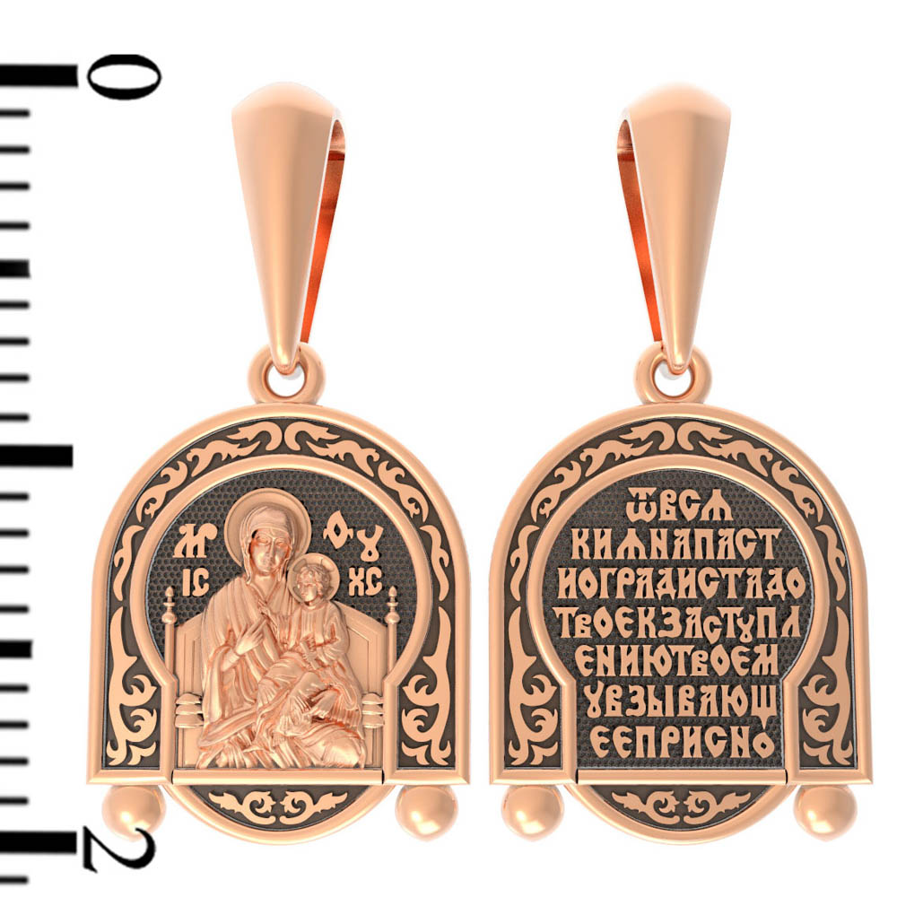 На обороте образка написана молитва Богородице в честь Ее иконы «Всецарица» (Пантанасса): «От всякия напасти огради стадо Твое, к заступлению Твоему взывающее присно».