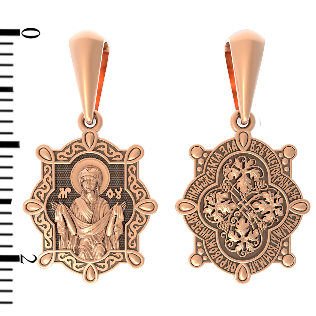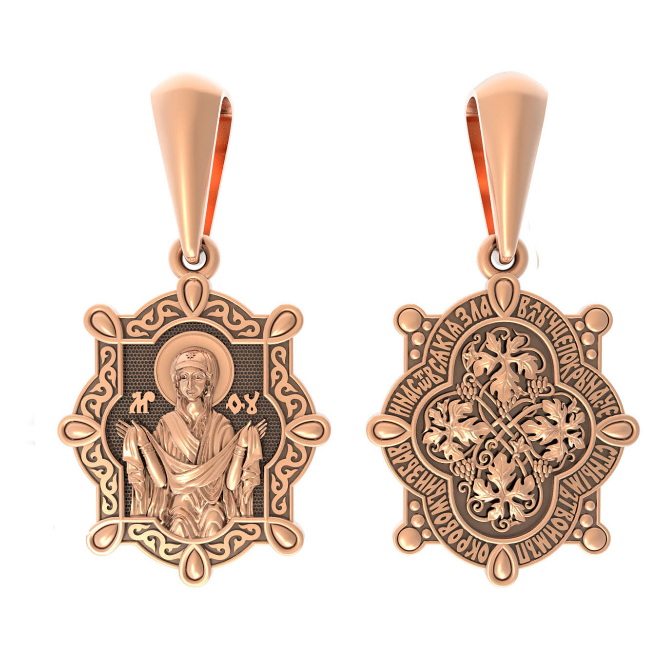 На лицевой части образка изображена икона Покров Пресвятой Богородицы. Праздник Покрова Божией Матери является воспоминанием чуда, которое произошло во Влахнернской церкви 1 (14) октября 910 года: Пресвятая Богородица явилась верующим над алтарем храма и распростерла над ними Свое покрывало. В этот день Божья Матерь открыла людям, что Она является Ходатаицей за них перед Богом. Богородица простирает Свой молитвенный покров над всеми православными христианами и умоляет Сына Своего о даровании вечного спасения каждому человеку.