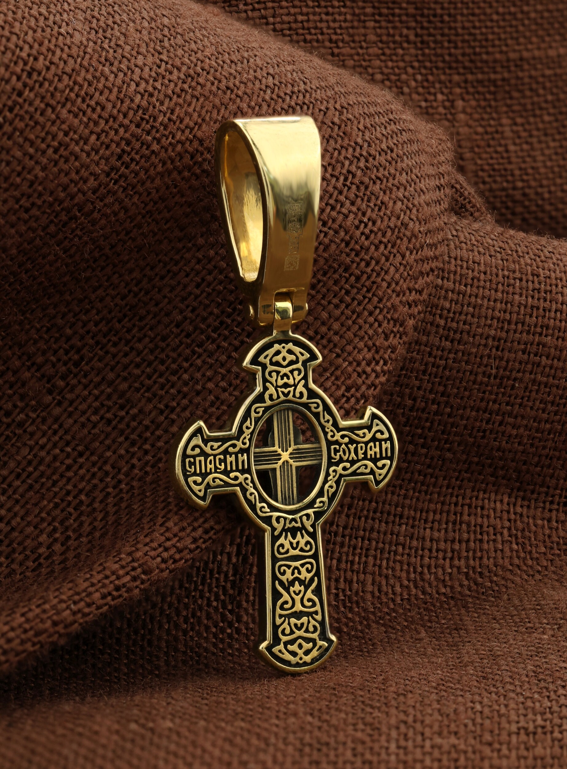 Оборотная сторона креста украшена растительным орнаментом. Помещенный на крест орнамент символизирует жизнедательную силу, животворное тепло креста. В растительный узор, на горизонтальной перекладине, вписано молитвенное славословие: «Спаси и сохрани». Эта надпись означает непрерывную молитву, совершаемую носителем данного креста.