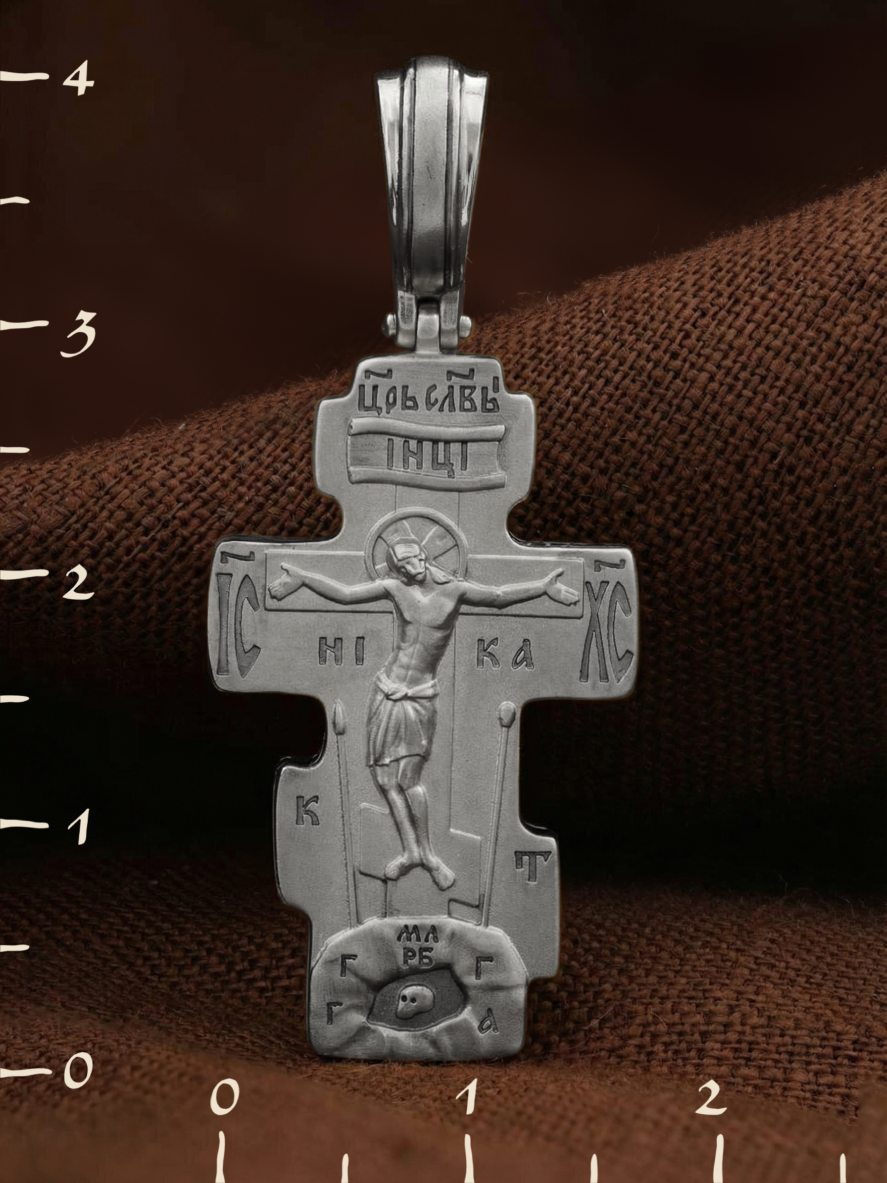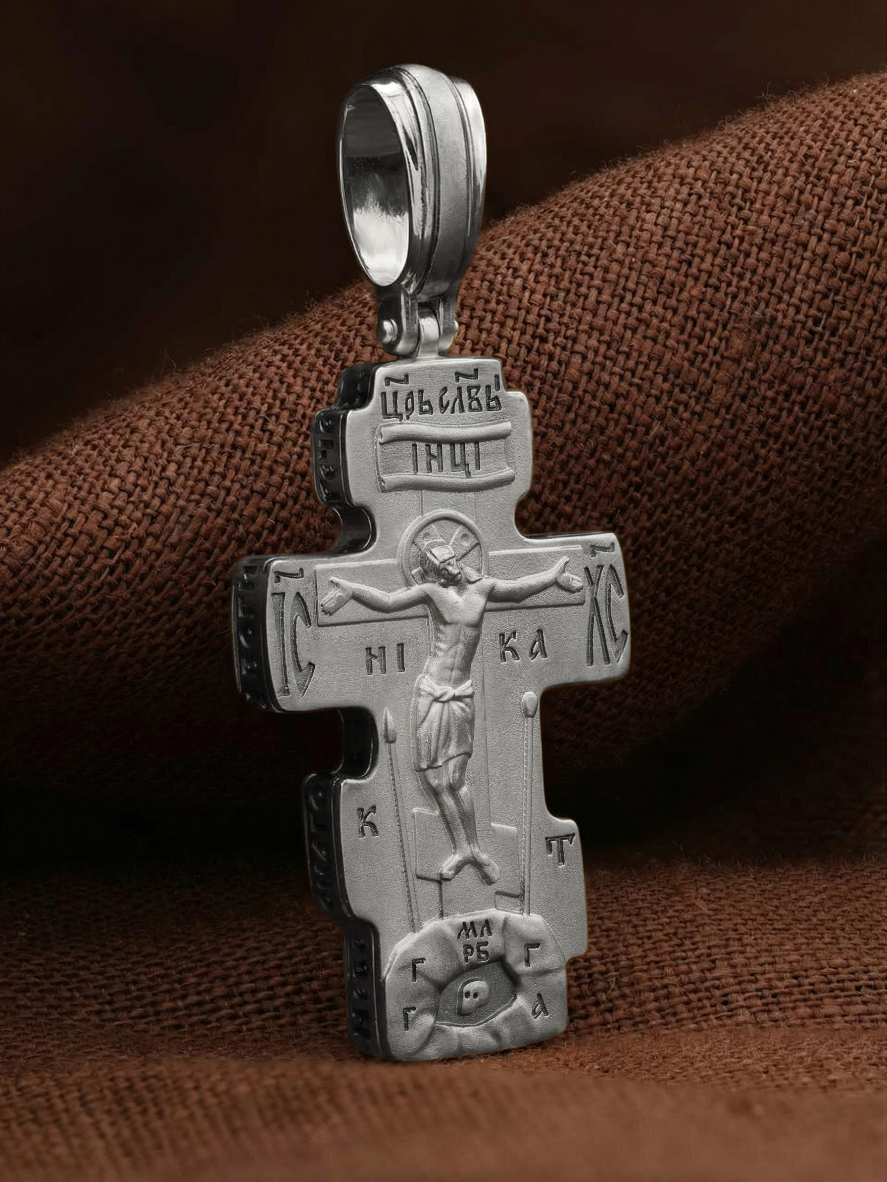 На лицевой стороне креста изображено Распятие Господа и Спасителя нашего Иисуса Христа. Крест- символ спасения и искупления рода человеческого, знамение победы над смертью и адом. Иисус Христос, как искупительная жертва освобождения человечества от власти греха, умер крестной смертью и в третий день воскрес. Над вершиной Распятия помещена надпись «Царь Славы». На верхней табличке, выше головы Иисуса, расположена надпись, составленная Понтием Пилатом — «IНЦI». Она означает «Иисус Назорей, Царь Иудейский». Надпись «IC» «ХC», означает Иисус Христос, помещается на разных сторонах поперечной перекладины креста. Под ней помещено слово «НIКА», что означает Победитель. Крест стоит на горе камней, символизирующих Голгофу, которая обозначена надписью «Г Г». В ее основании различается череп — это голова Адама, обозначенный надписью «Г А». Надпись «МЛРБ» — «место лобное рай бысть» означает место лобное стало раем. Вдоль креста изображены орудия Страстей Христовых: копие сотника Лонгина, которым пронзили подреберье мёртвого Иисуса, чтобы убедиться в Его смерти, и трость с губкой, с которой Иисуса напоили уксусом. Они обозначены буквами «К» и «Т».