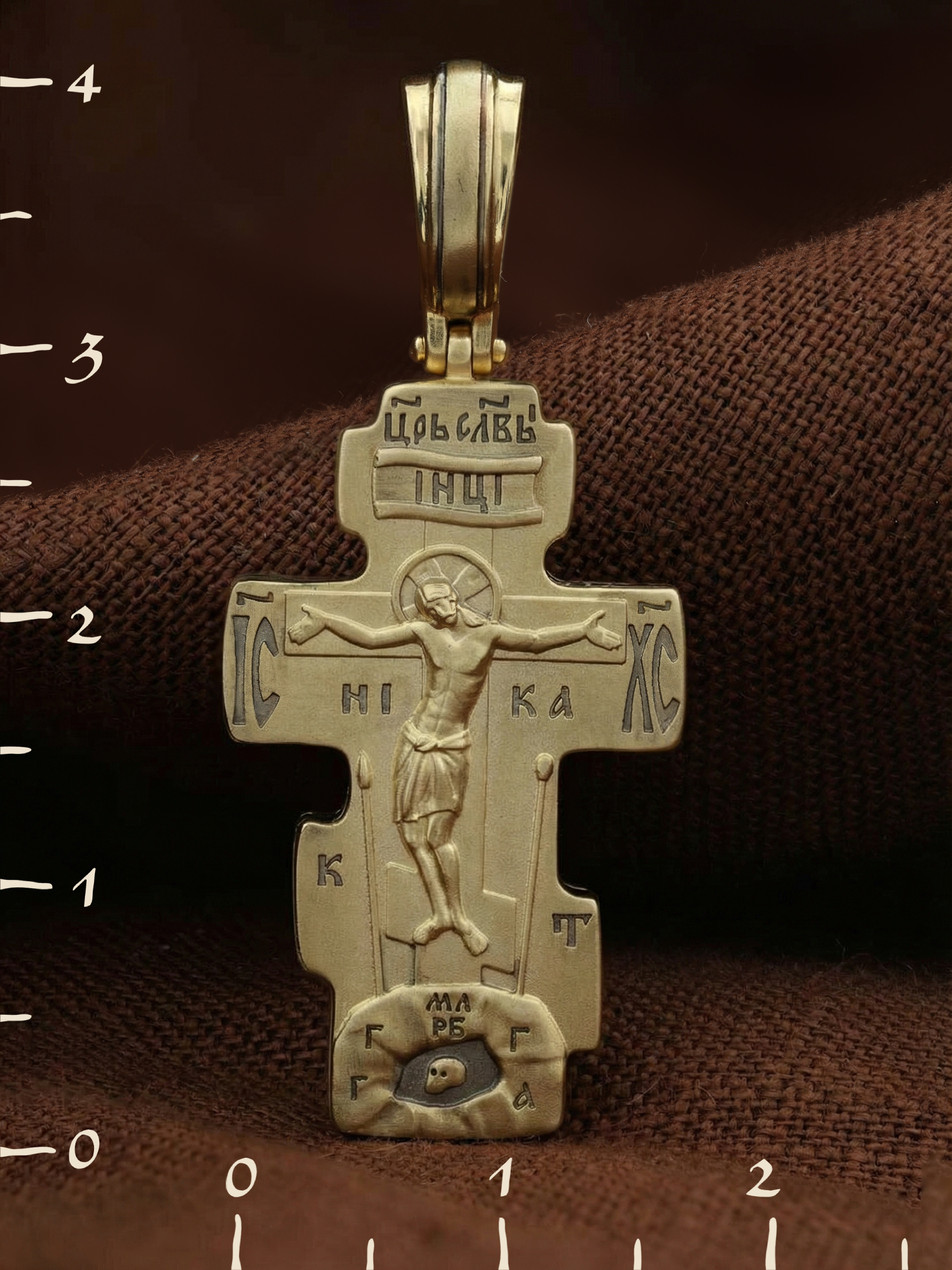 На лицевой стороне креста изображено Распятие Господа и Спасителя нашего Иисуса Христа. Крест- символ спасения и искупления рода человеческого, знамение победы над смертью и адом. Иисус Христос, как искупительная жертва освобождения человечества от власти греха, умер крестной смертью и в третий день воскрес. Над вершиной Распятия помещена надпись «Царь Славы». На верхней табличке, выше головы Иисуса, расположена надпись, составленная Понтием Пилатом — «IНЦI». Она означает «Иисус Назорей, Царь Иудейский». Надпись «IC» «ХC», означает Иисус Христос, помещается на разных сторонах поперечной перекладины креста. Под ней помещено слово «НIКА», что означает Победитель. Крест стоит на горе камней, символизирующих Голгофу, которая обозначена надписью «Г Г». В ее основании различается череп — это голова Адама, обозначенный надписью «Г А». Надпись «МЛРБ» — «место лобное рай бысть» означает место лобное стало раем. Вдоль креста изображены орудия Страстей Христовых: копие сотника Лонгина, которым пронзили подреберье мёртвого Иисуса, чтобы убедиться в Его смерти, и трость с губкой, с которой Иисуса напоили уксусом. Они обозначены буквами «К» и «Т».