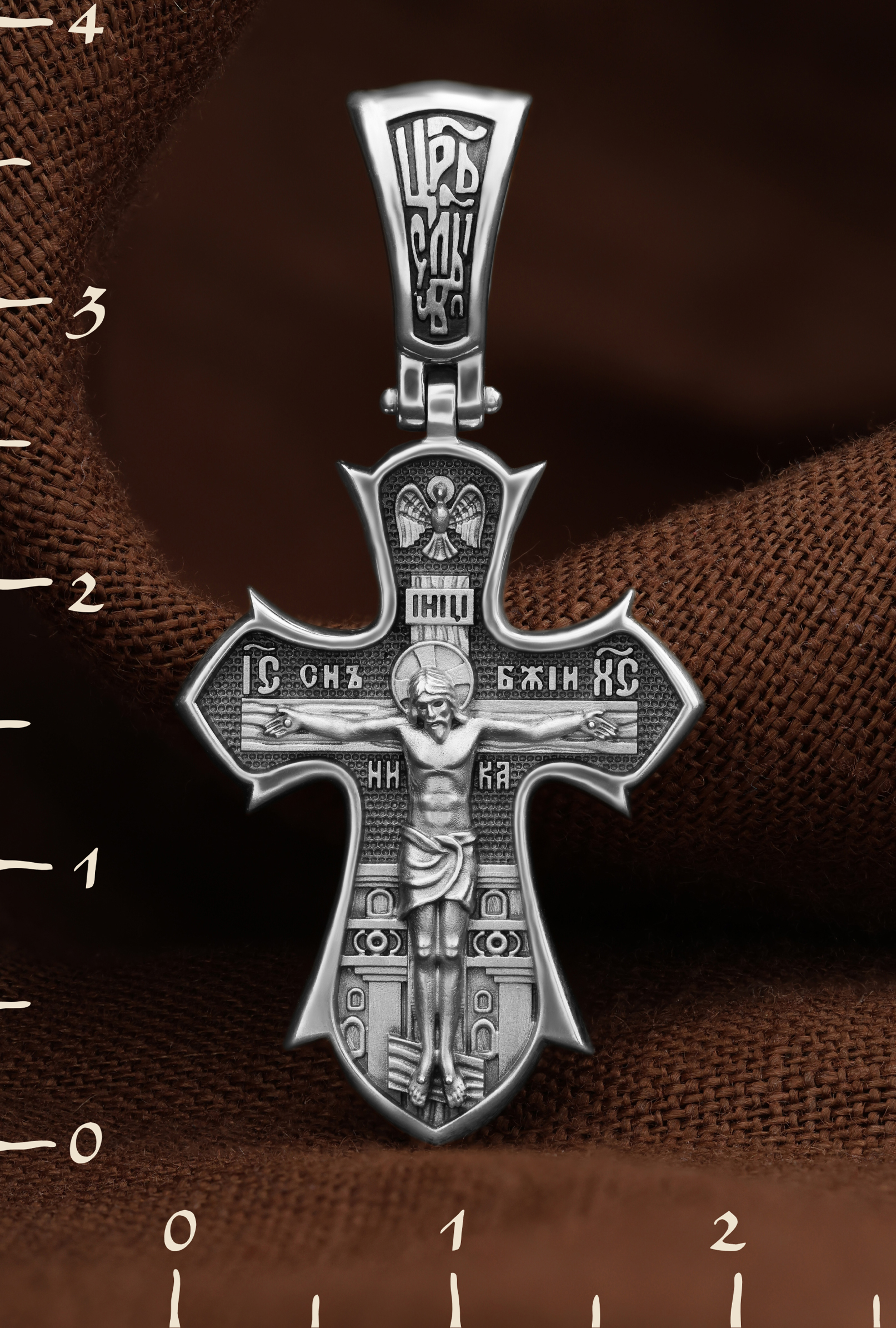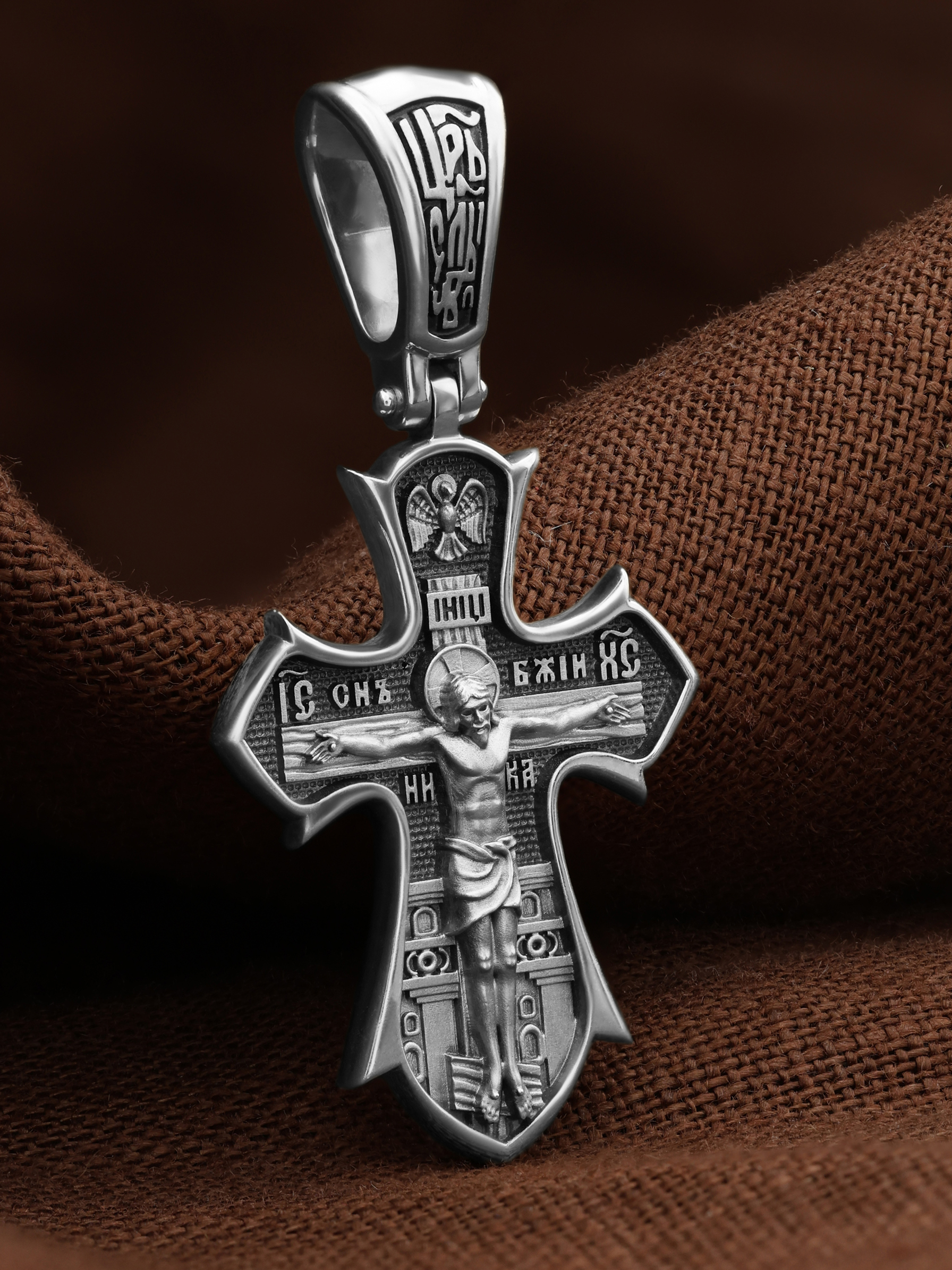 На лицевой стороне креста изображено распятие Господа нашего Иисуса Христа. Позади Распятия видна иерусалимская стена, знак того, что Господь был распят вне стен города. Но вместе с тем стена символизирует и Небесный Иерусалим, путь который открылся для человека через Голгофу. На кулоном кольце видим слова «ЦРЬ СЛВЫ» — Царь Славы. Верхняя перекладина символизирует собой табличку с надписью «IHЦI» — Иисус Назарянин Царь Иудейский. Над перекладиной пишется сокращенно имя Спасителя «IC XC» — Иисус Христос и словосочетание «СНЪ БЖIЙ» — «СЫН БОЖИЙ». Рядом с образом Христа помещены слова — «НИКА» (греч. — Победитель). Возвышение, на котором стоит Крест, символизирует гору Голгофу, на которой произошло Распятие. У подножия Креста изображают прах Адама, обозначенный черепом.