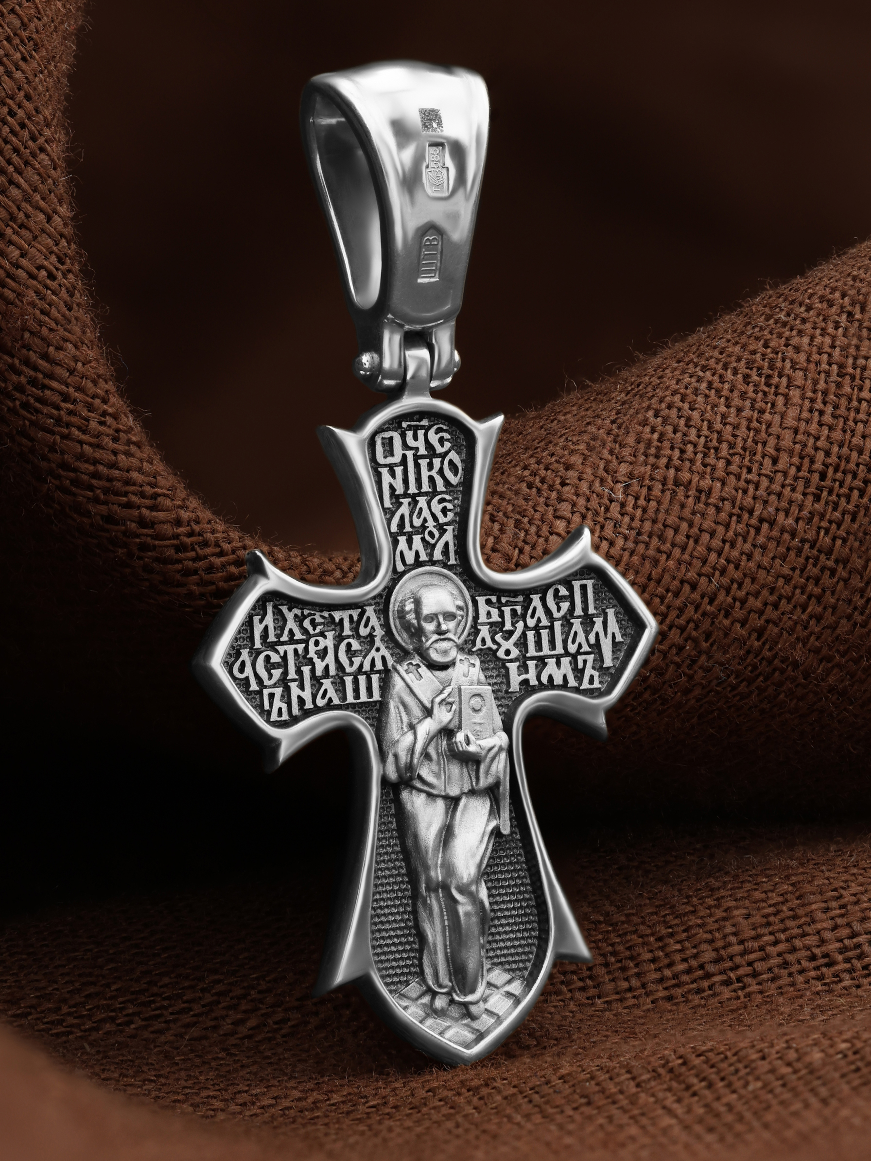 Оборотную сторону креста возглавляет икона Святителя Николая Чудотворца, которого еще называют Николай Угодник за то, что он угодил своей жизнью Богу. Николай Чудотворец, помощник в делах, покровитель учащихся, утешитель обиженных. Также Святитель Николай Чудотворец известен своими молитвами за путешественников, когда непрестанный ветер и бушующие волны утихают и корабль заходит в спокойную гавань. На кресте написана молитва: «Отче Николае, моли Христа Бога спастися душам нашим».