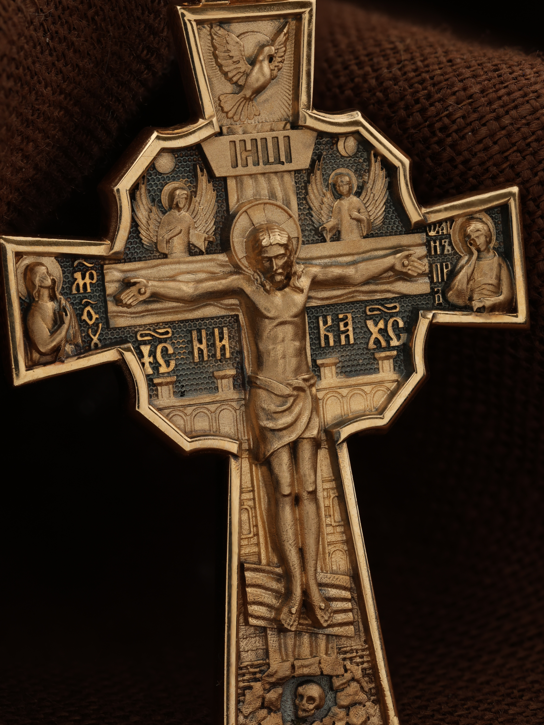 Над Распятием изображен парящий голубь — символ Святого Духа и Его благодати. На кулонном кольце изображен шестикрылый Серафим — самый приближенный к Господу Ангел.