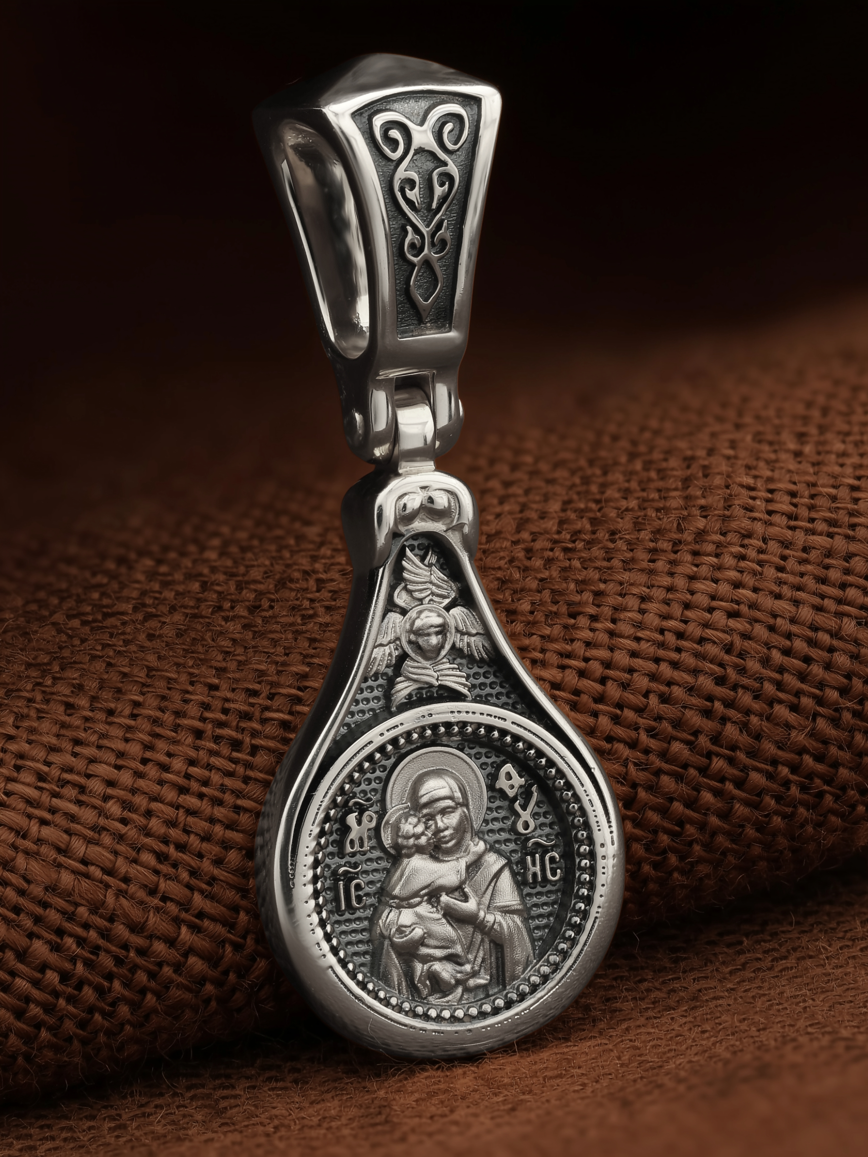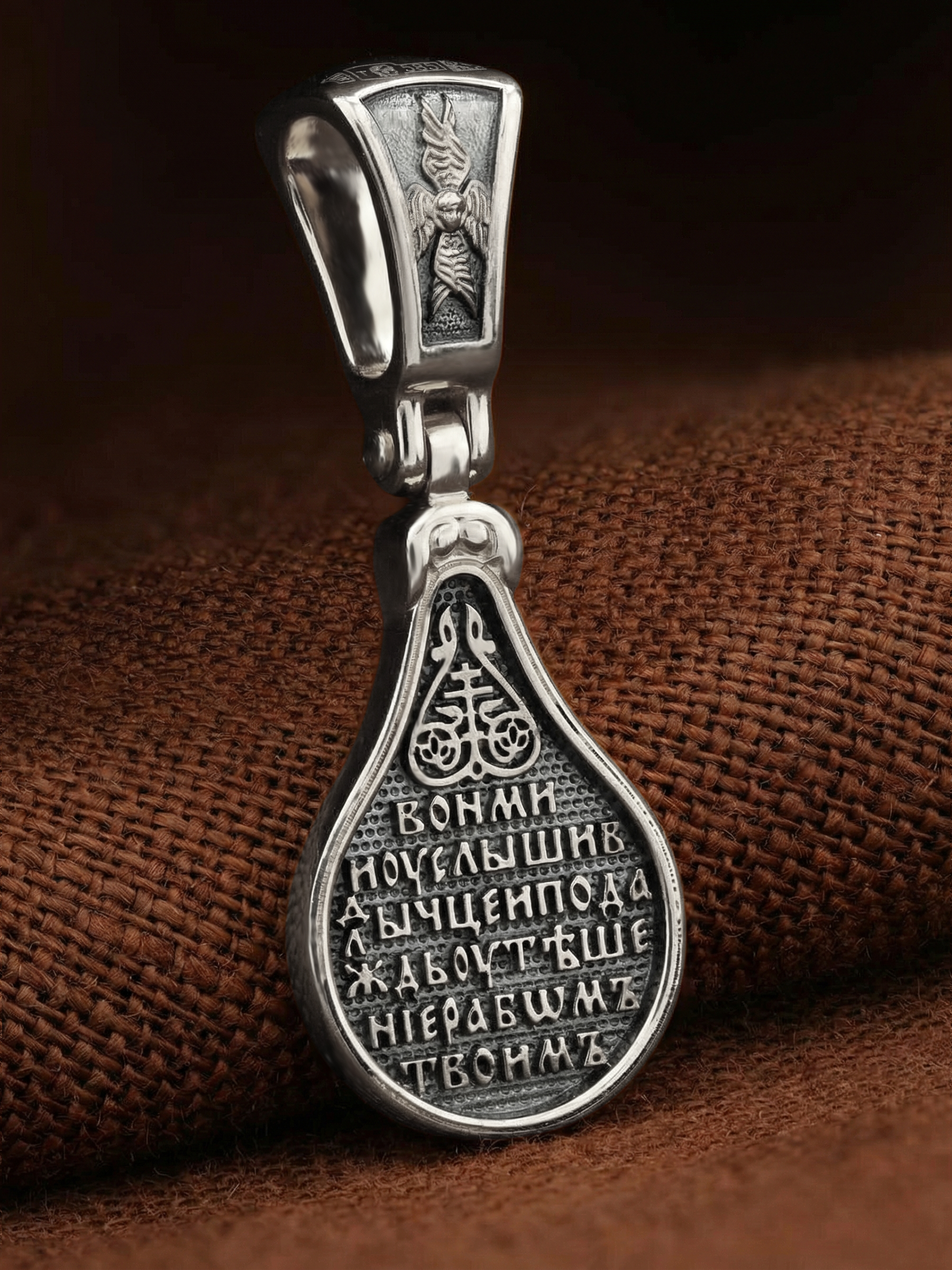 Лицевую сторону образка и кулонное кольцо украшает шестикрылый Серафим — самый приближенный к Господу Ангел.