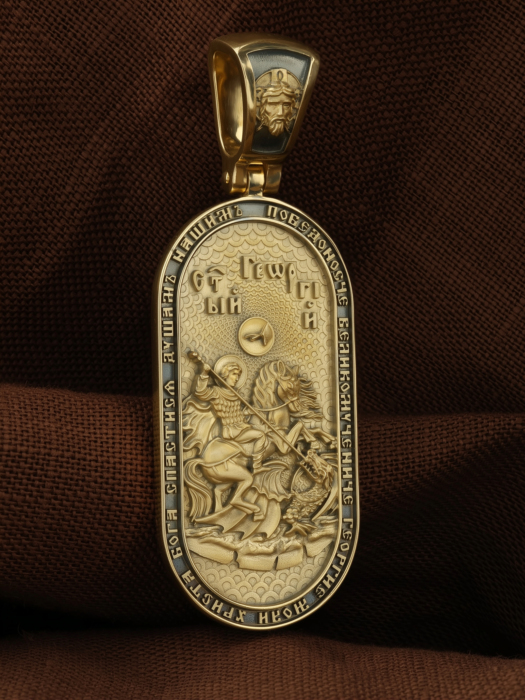 По контуру написана молитва: «Победоносче Великомучениче Георгие, моли Христа Бога спастися душам нашим». На кулонном кольце изображен Спас Нерукотворный — Символ вочеловечившегося Божества.