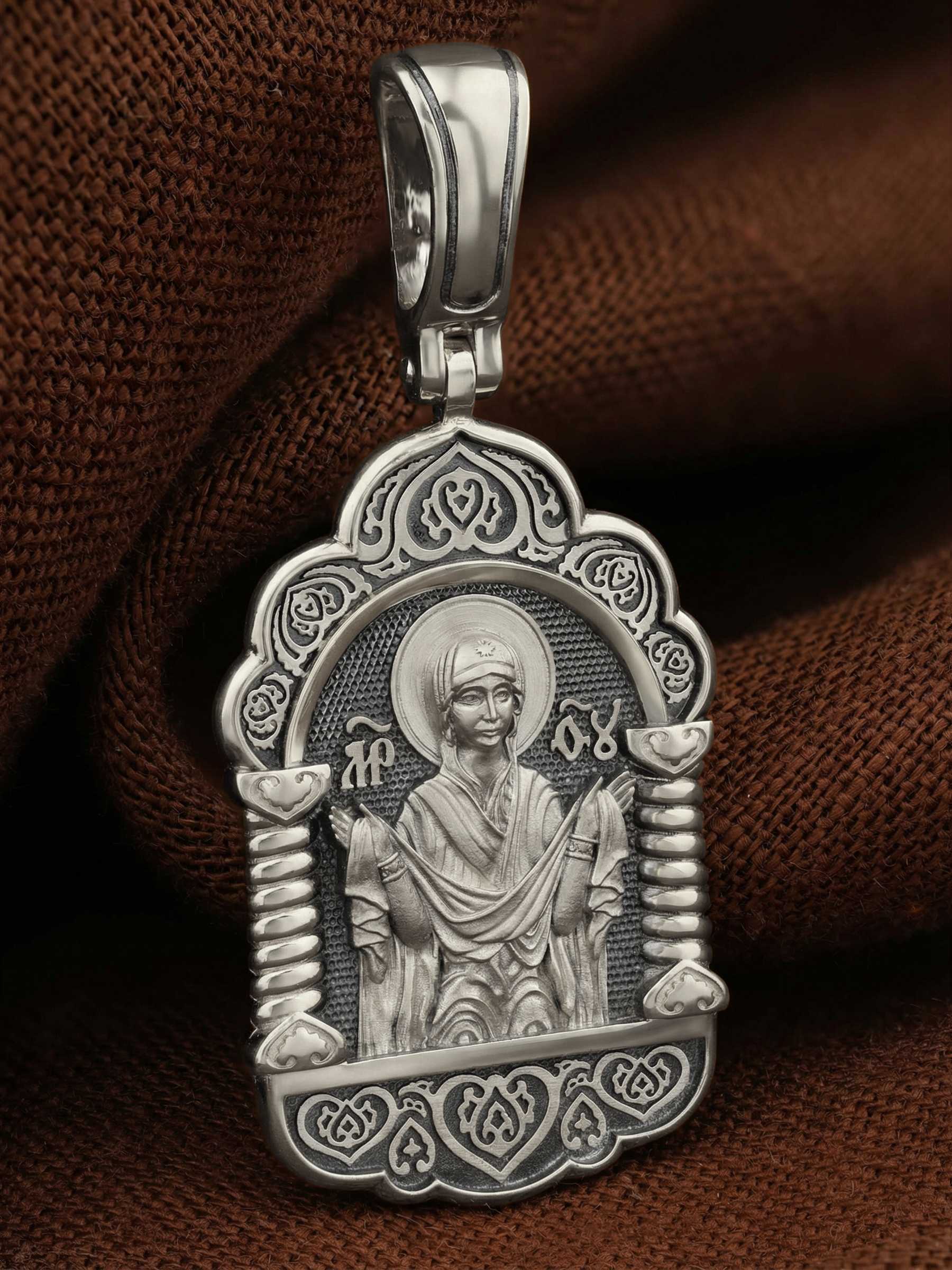 На лицевой части образка изображена икона Покров Пресвятой Богородицы. Праздник Покрова Божией Матери является воспоминанием чуда, которое произошло во Влахнернской церкви 1 (14) октября 910 года: Пресвятая Богородица явилась верующим над алтарем храма и распростерла над ними Свое покрывало. В этот день Божья Матерь открыла людям, что Она является Ходатаицей за них перед Богом. Богородица простирает Свой молитвенный покров над всеми православными христианами и умоляет Сына Своего о даровании вечного спасения каждому человеку