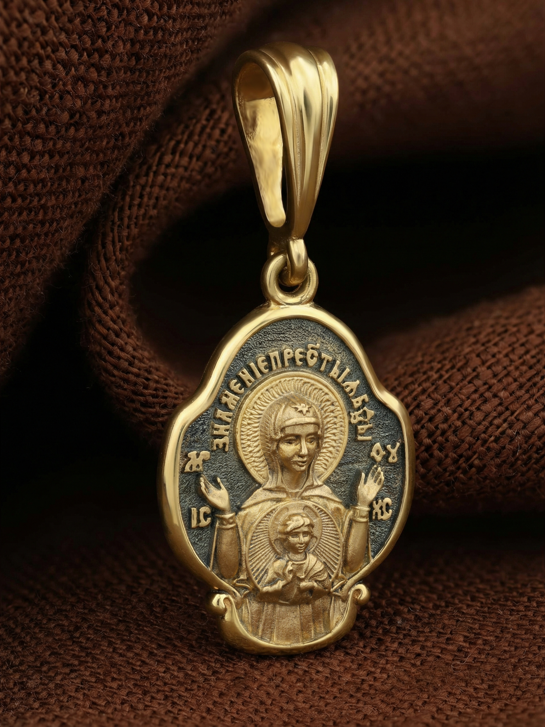 В центр образка помещен образ Божией Матери «Знамение», прославившийся многими чудесами в Новгороде в XII веке. Икона эта чтится как одна из самых великих святынь Русской земли. Молитвенно воздетые руки Богородицы означают заступничество за людей пред Богом. Рядом с Ней, на фоне круглого щита, — благословляющий Божественный Младенец — Спас-Эммануил.