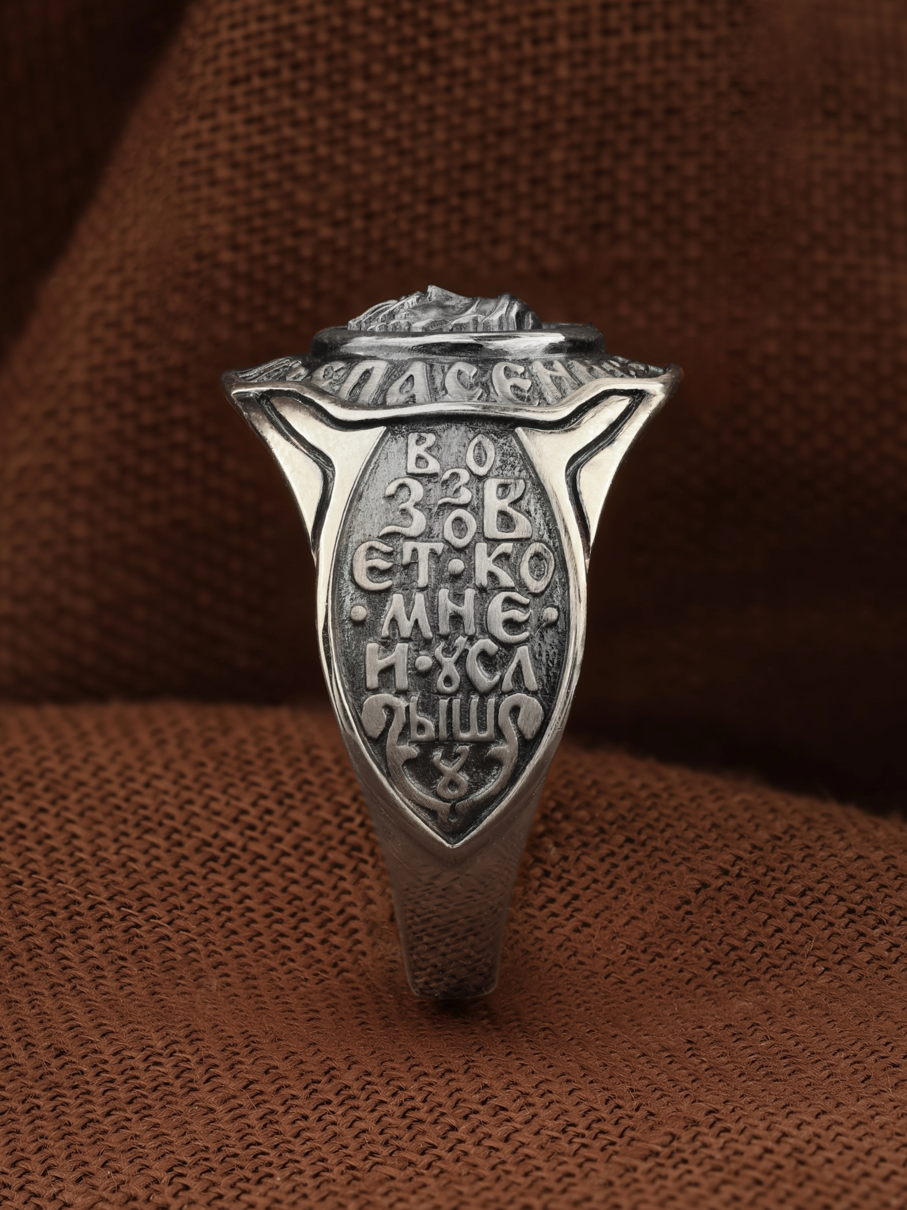 Кольцо «Господь Вседержитель» выполнено в древних христианских традициях. Спас Нерукотворный — образ Господа и Спасителя нашего Иисуса Христа, чудесно отпечатавшийся на плате, котором Христос вытер свой лик. Согласно Преданию, изложенному в Четьи Минее, Авгарь V Ухама, больной проказой, послал ко Христу своего архивария Ханнана (Ананию) с письмо, в котором просил Христа прийти в Едессу и исцелить его. Ханнан же был художником, и Авгарь поручил ему, если Спаситель не сможет прийти, то написать хотя бы Его образ и принести ему. Видя, что Ханнан хочет сделать Его портрет, Христос потребовал воды, умылся, вытер Свой лик платом, и на этом плате отпечатался Его образ. Спаситель передал этот плат Ханнану с повелением отнести с ответным письмом пославшему его. Получив портрет, Авгарь исцелился от главного своего недуга, но лицо его оставалось еще поврежденным. После Пятидесятницы в Едессу пошёл святой апостол Фаддей, один из 70-ти, закончил исцеление Авгаря и обратил его в христианство. Авгарь прикрепил образ к доске и поместил в нише над городскими воротами, убрав оттуда находившегося там идола. Лик Спасителя — в трехчастно разделенном нимбе, на котором начертана греческая монограмма «WOИ», что означает «Сущий» или «Тот, кто есть». Вокруг образа Спаса Нерукотворного надпись: «Явлю ему спасение Моё»